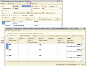 В поле «Задолженность по зарплате» указывается сумма задолженности перед работником (вносится как положительное значение) или задолженности работника перед организацией (вносится как отрицательное значение). После проведения документа данная сумма будет отражена как кредитовый остаток счета 3350 «Краткосрочная задолженность по оплате труда».