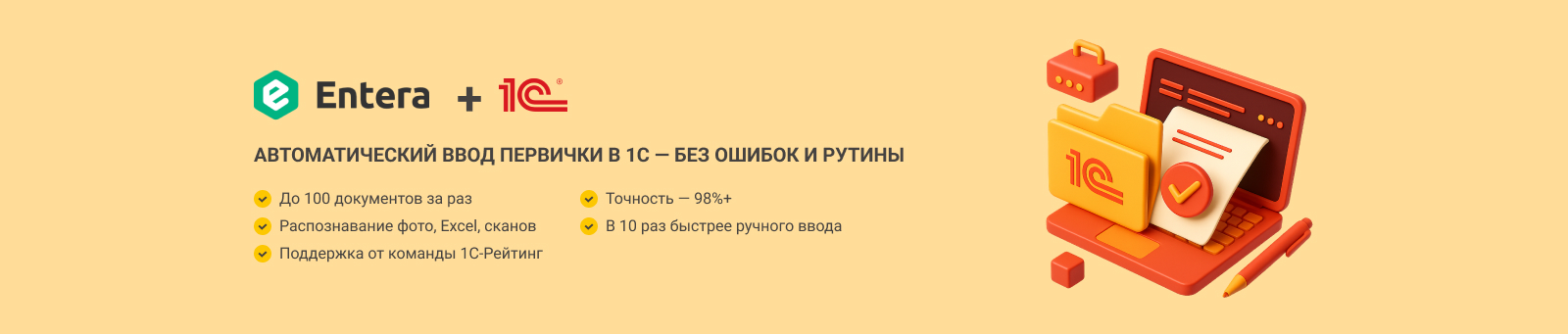 Компания «1С-Рейтинг» предлагает воспользоваться облачным сервисом «Entera» — современным решением для автоматического распознавания и загрузки первичной бухгалтерской документации в систему «1С:Предприятие».
