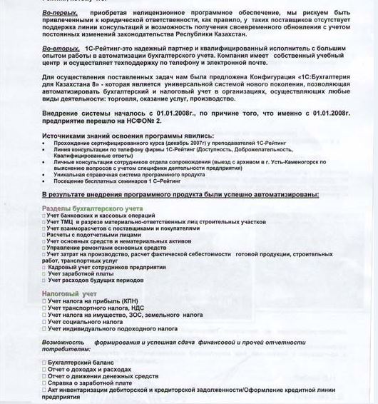 - Личные консультации сотрудников отдела сопровождения (выезд с архивом в г. Усть-Каменогорск по выяснению вопросов с учетом специфики деятельности предприятия).