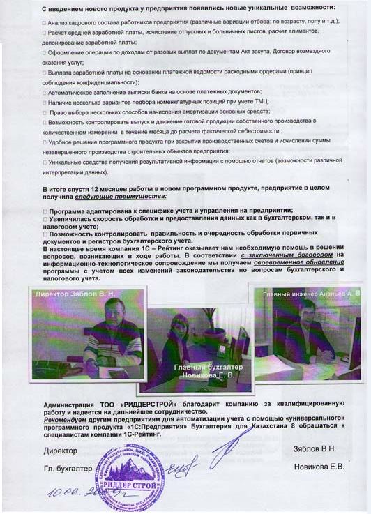 «Администрация ТОО «РИДДЕРСТРОЙ» благодарит компанию за квалифицированную работу и надеется на дальнейшее сотрудничество. Рекомендуем другим предприятиям для автоматизации учета с помощью «универсального» программного продукта «1С:Бухгалтерия для Казахстана 8» обращаться к специалистам компании «1С-Рейтинг».