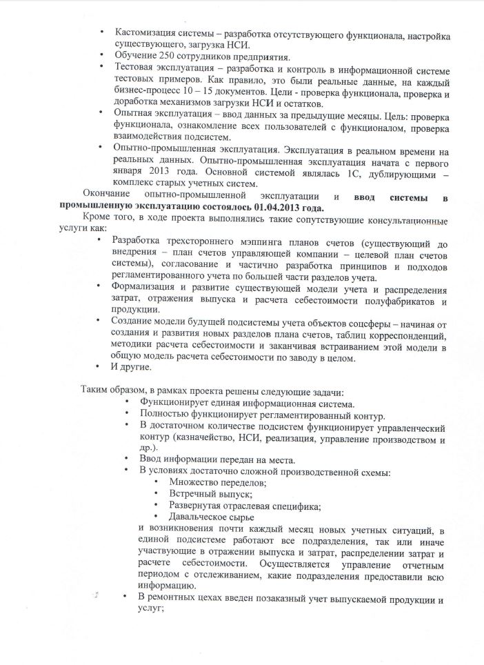 «Планы по внедрению в рамках выполненных работ были реализованы в полном объеме. Хотелось бы отметить, что с помощью единой информационной системы, охватившей большинство подразделений завода, достигнут достаточно серьезный уровень прозрачности бизнес-процессов, в значительной степени усилен контроль за финансовыми потоками предприятия, что в совокупности позволяет принимать достаточно взвешенные управленческие решения».