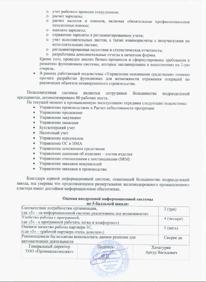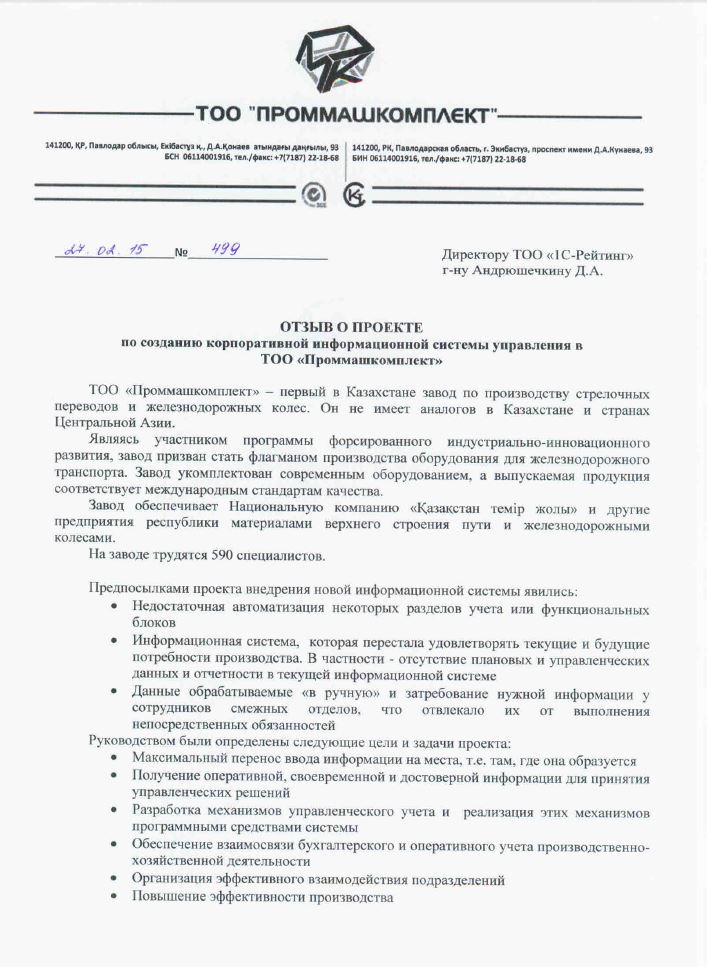 Компания «1С-Рейтинг» автоматизировала ТОО «Проммашкомплект» — первый в Казахстане завод по производству стрелочных переводов и железнодорожных колес. Система, созданная на основе решения «1С:Управление производственным предприятием для Казахстана», охватила 80 рабочих мест, позволила организовать эффективное управление производством, ускорить и сделать более точным расчет себестоимости изделий. Руководство компании получило комплект инструментов для учета и контроля финансовой и производственной деятельности предприятия, а также усилило управленческий контроль над работой персонала.
