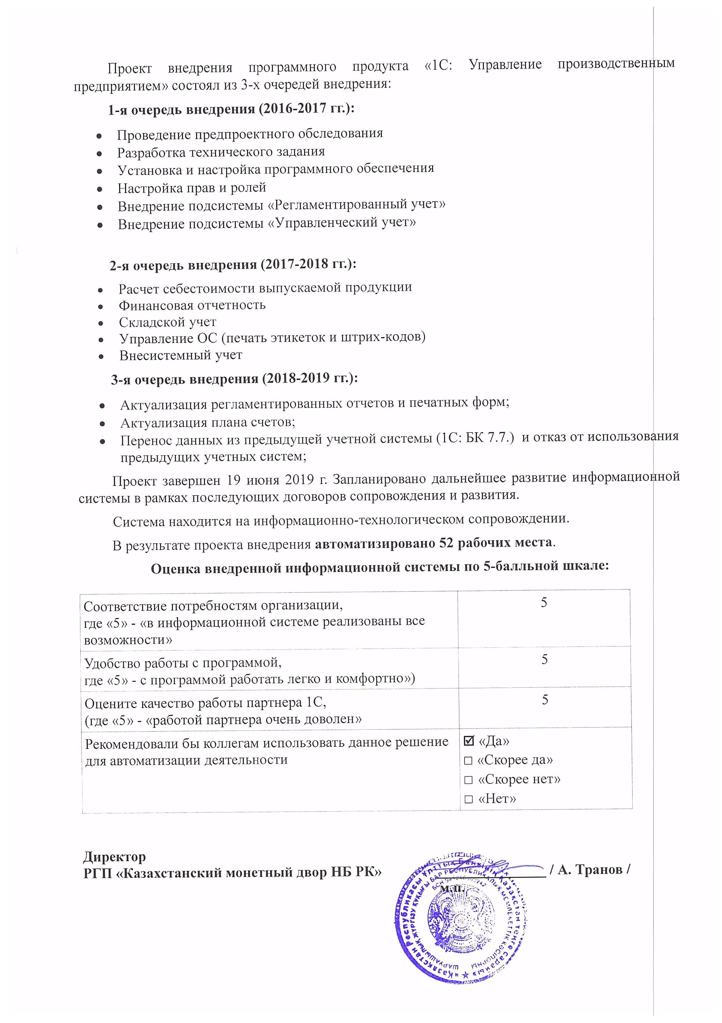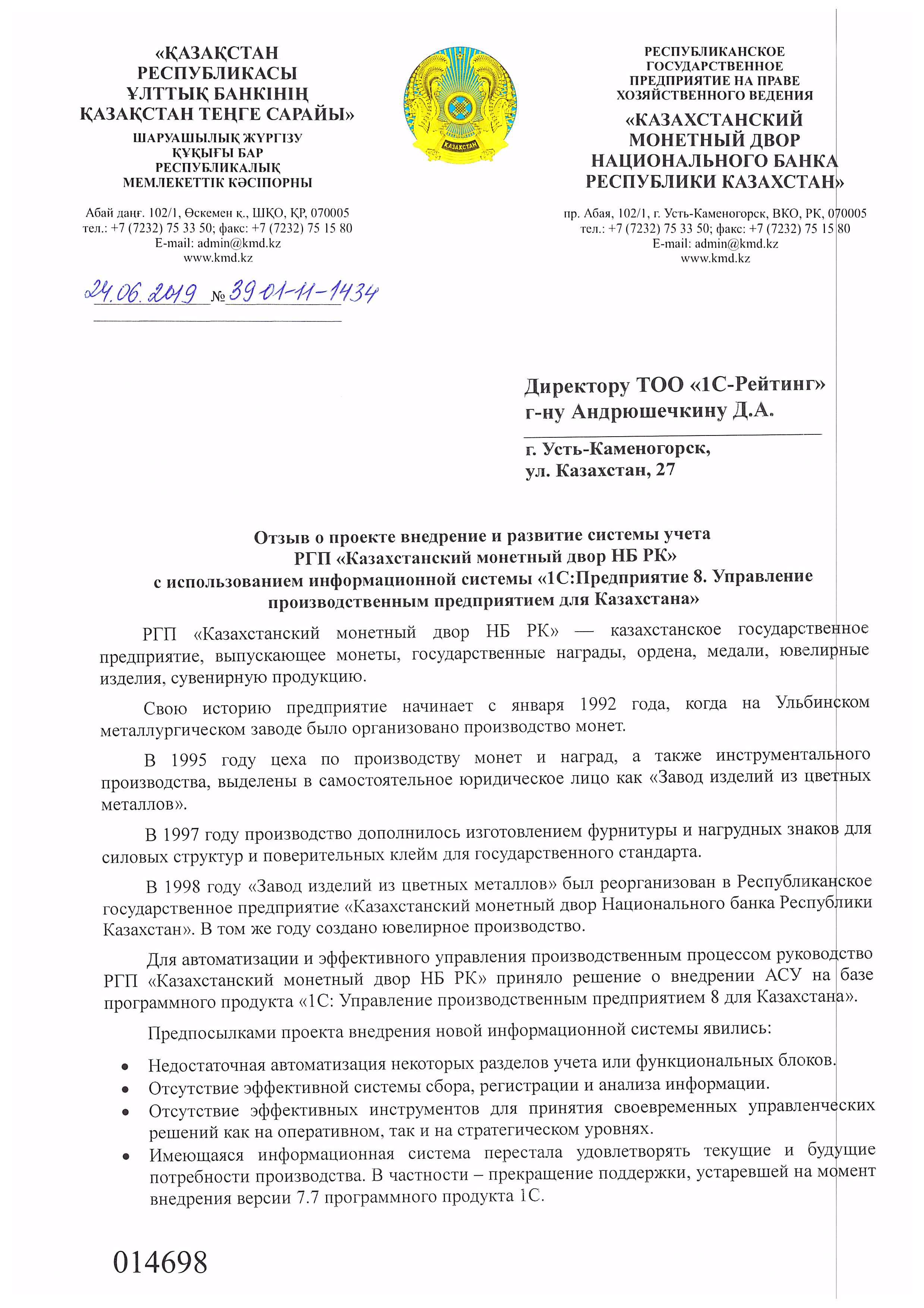 Для автоматизации и эффективного управления производственным процессом руководство РГП «Казахстанский монетный двор НБ РК» приняло решение о внедрении АСУ на базе программного продукта «1С:Управление производственным предприятием 8 для Казахстана».