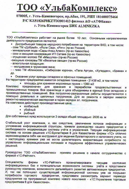 Руководство ТОО «УльбаКомплекс» приняло решение о начале сотрудничества с фирмой «1С-Рейтинг», перед специалистами которой на первом этапе проекта были поставлены следующие задачи: