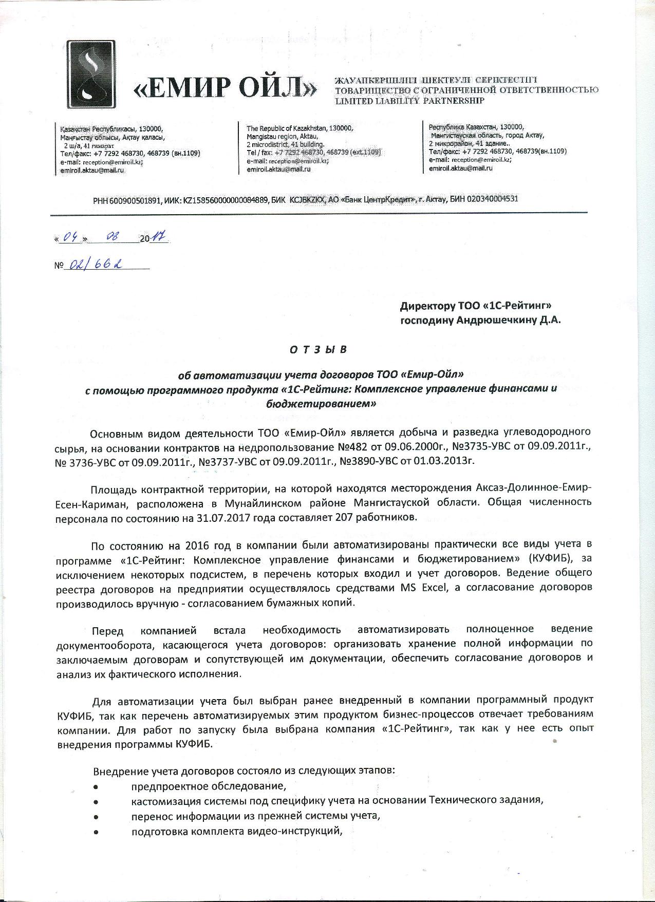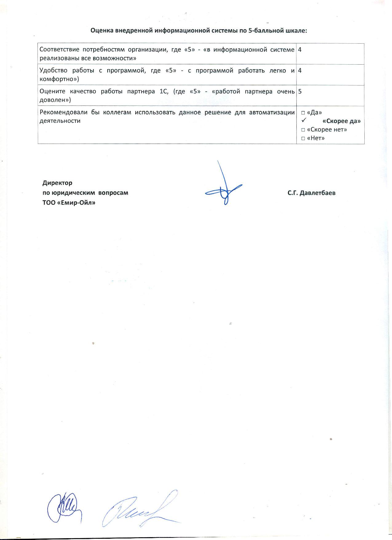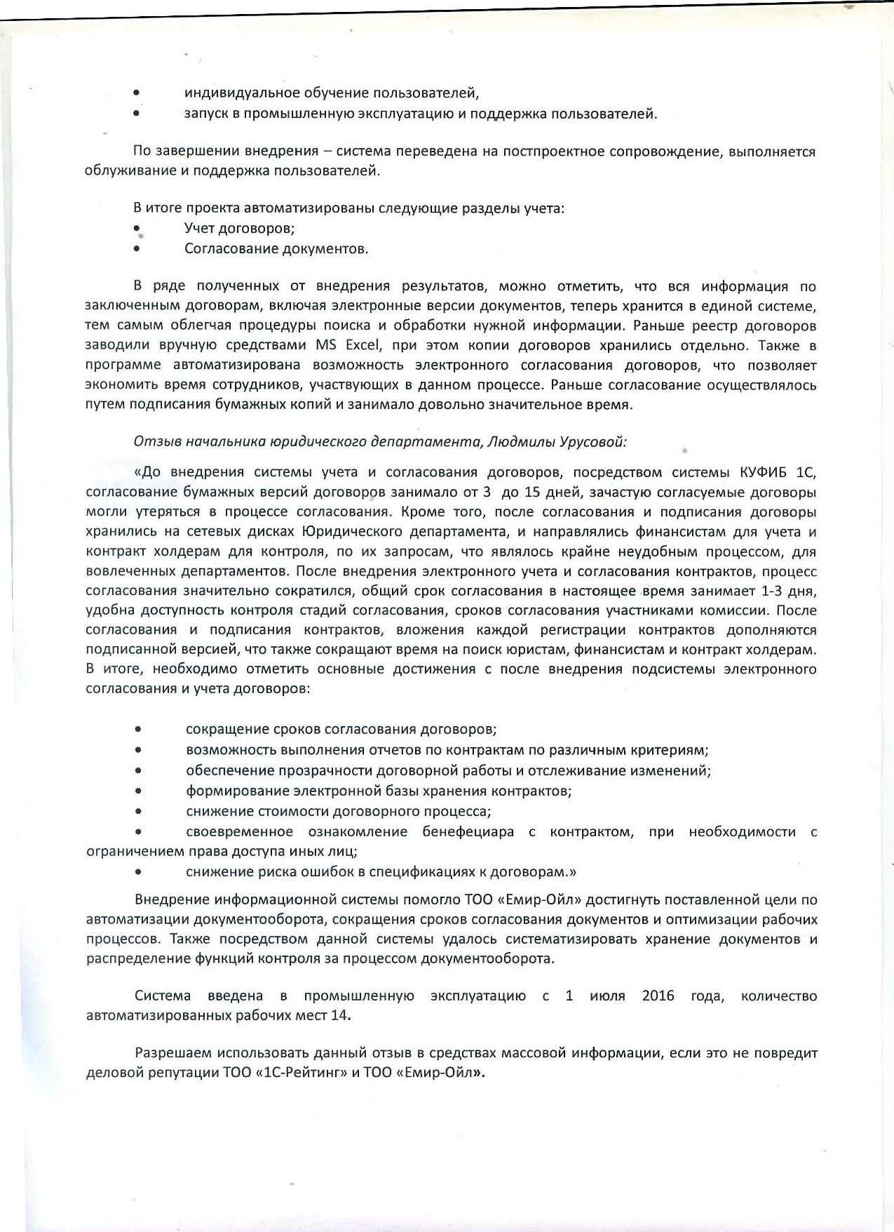 Внедрение информационной системы помогло ТОО «Емир-Ойл» достигнуть поставленной цели по автоматизации документооборота, сократить сроки согласования и оптимизировать рабочие процессы. Также удалось систематизировать хранение документов и распределение функций контроля за процессом документооборота.