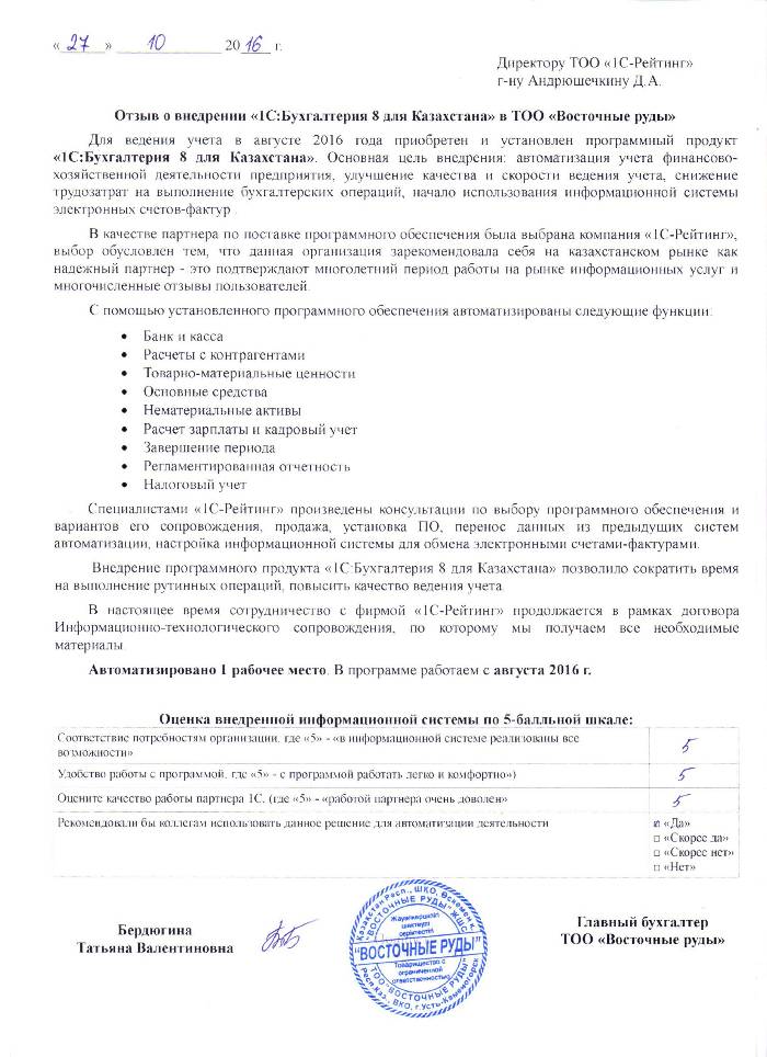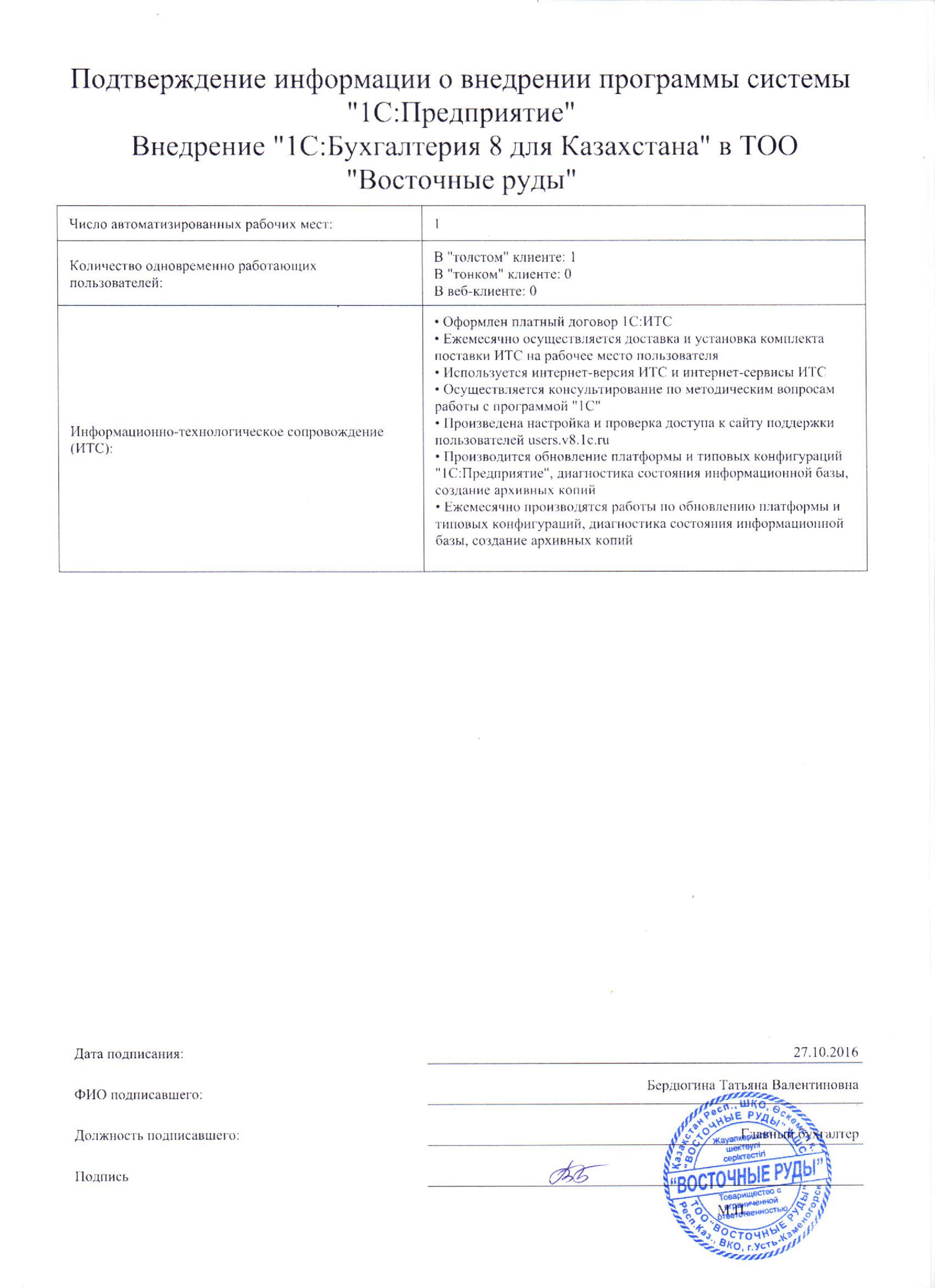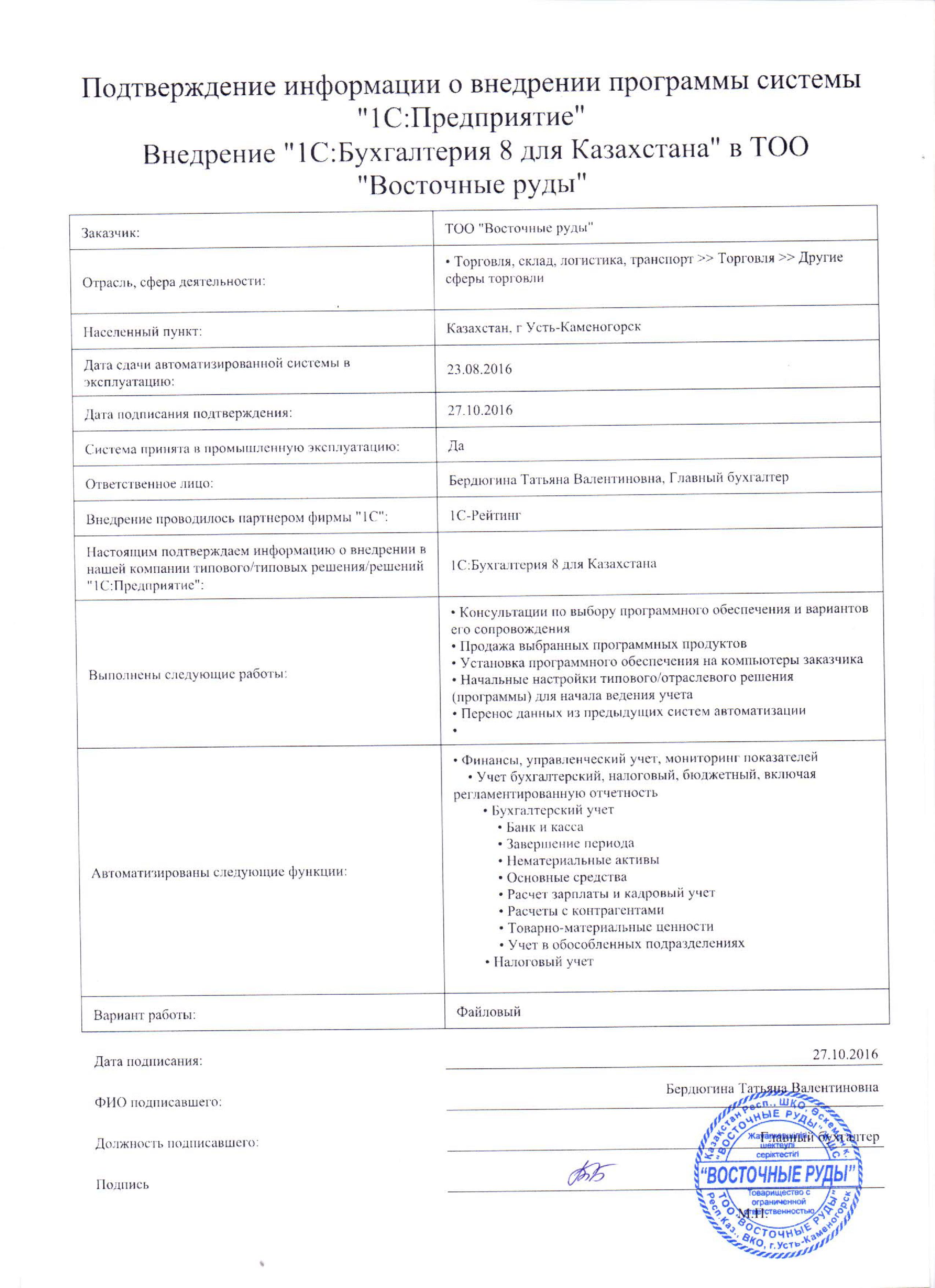 | Внедренное типовое решение: | 1С:Бухгалтерия 8 для Казахстана |