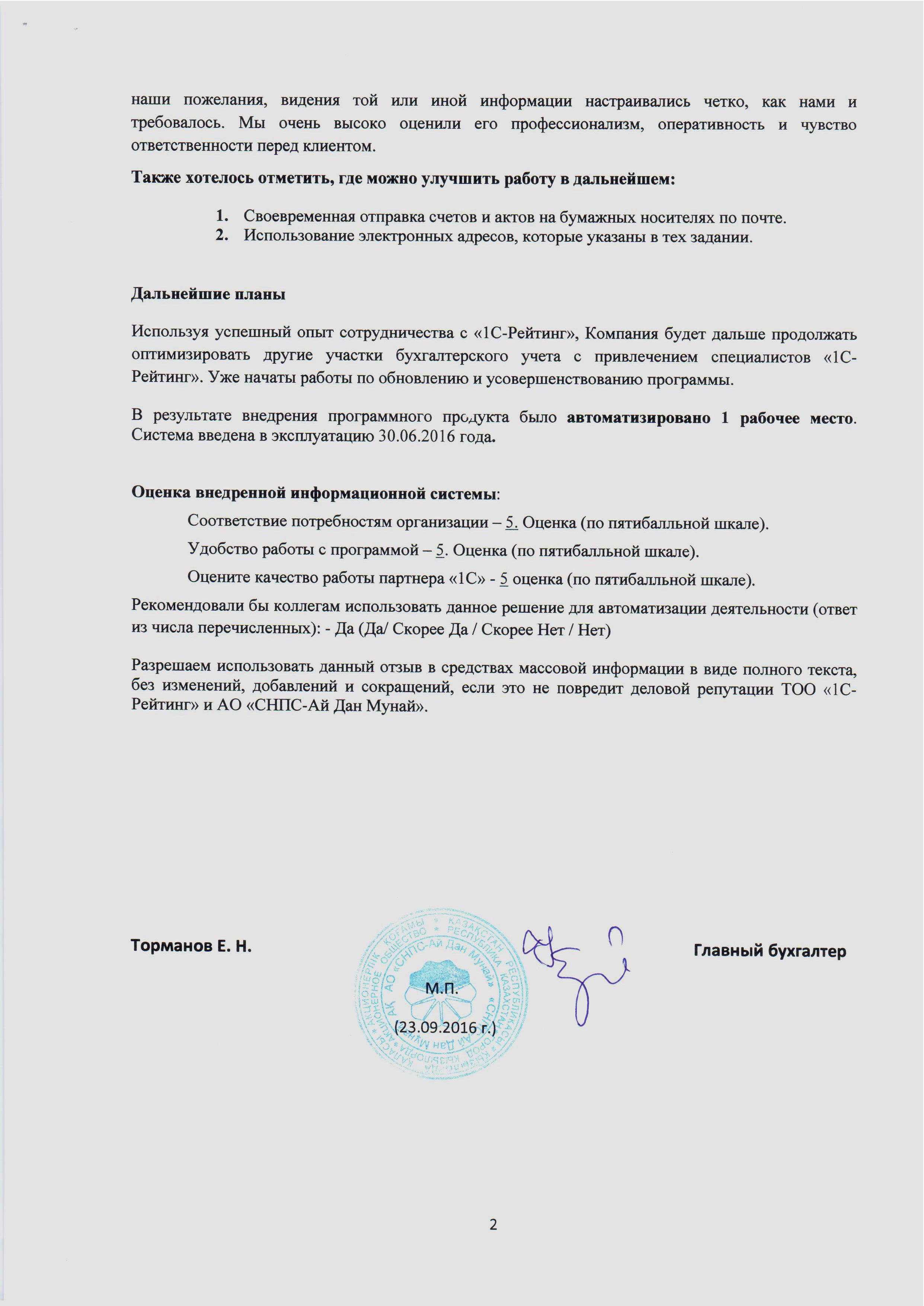 «В целом по проекту были получены только положительные результаты. Все запланированные ожидания от программы 1С на этапе автоматизации были достигнуты. Особенно хотелось бы отметить совместную работу с Деменевым Асхатом. Все доработки, настройки отчётов и многие наши пожелания, видения той или иной информации настраивались чётко, как нами и требовалось. Мы очень высоко оценили его профессионализм, оперативность и чувство ответственности перед клиентом.