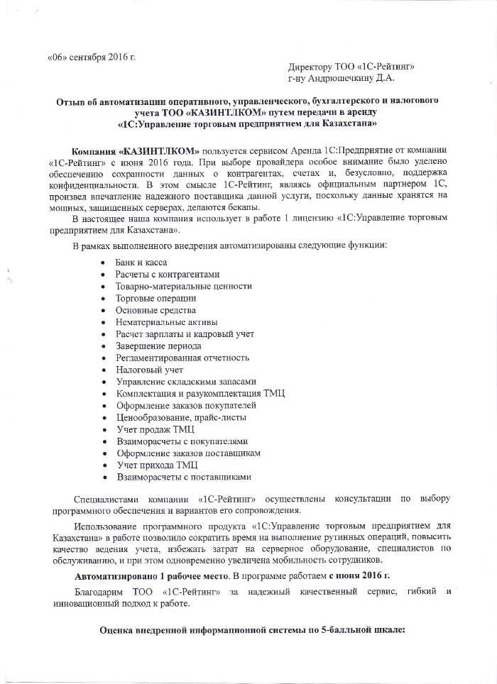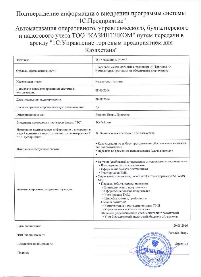 | Внедренное типовое решение: | 1С:Управление торговым предприятием для Казахстана |