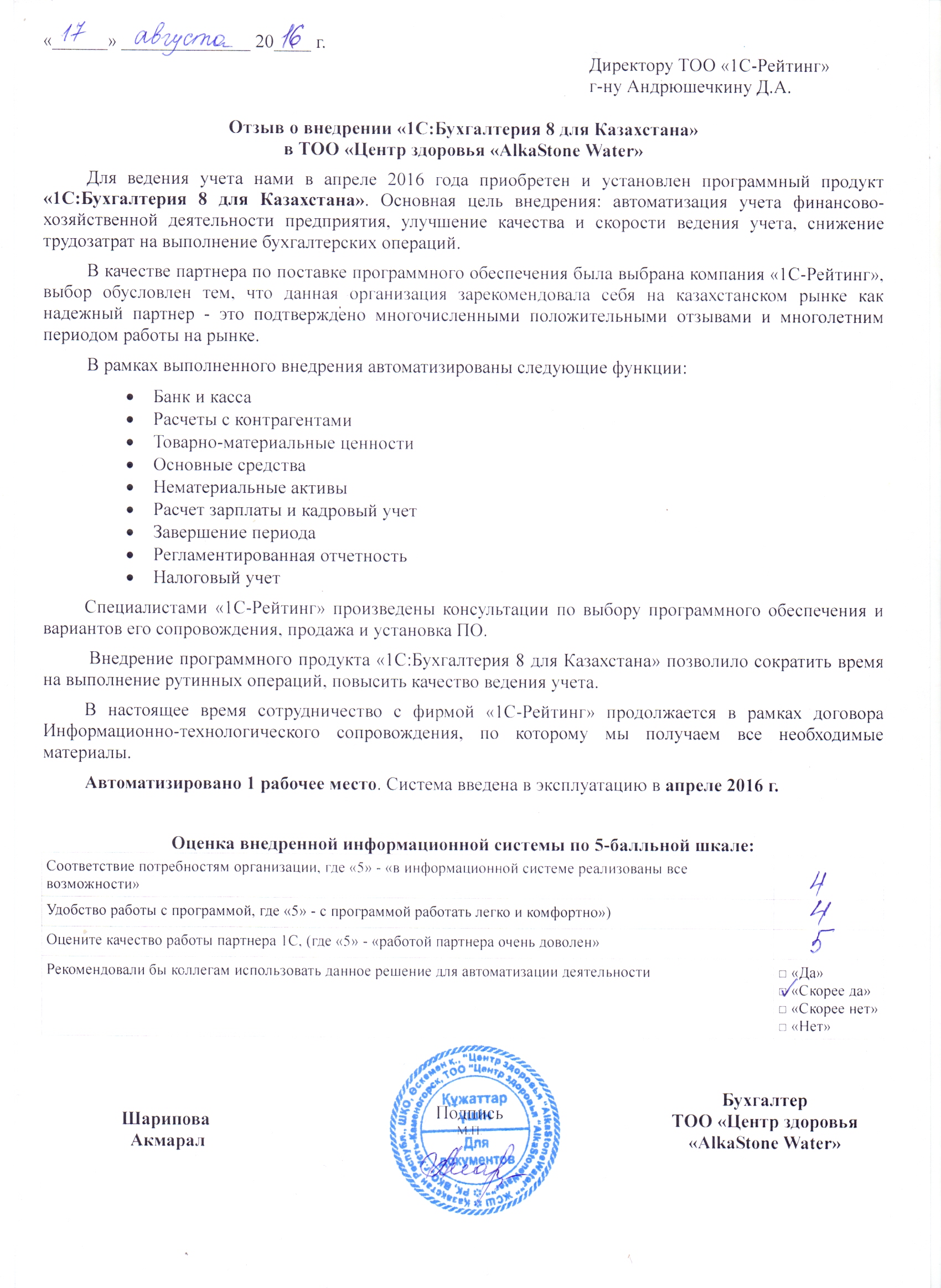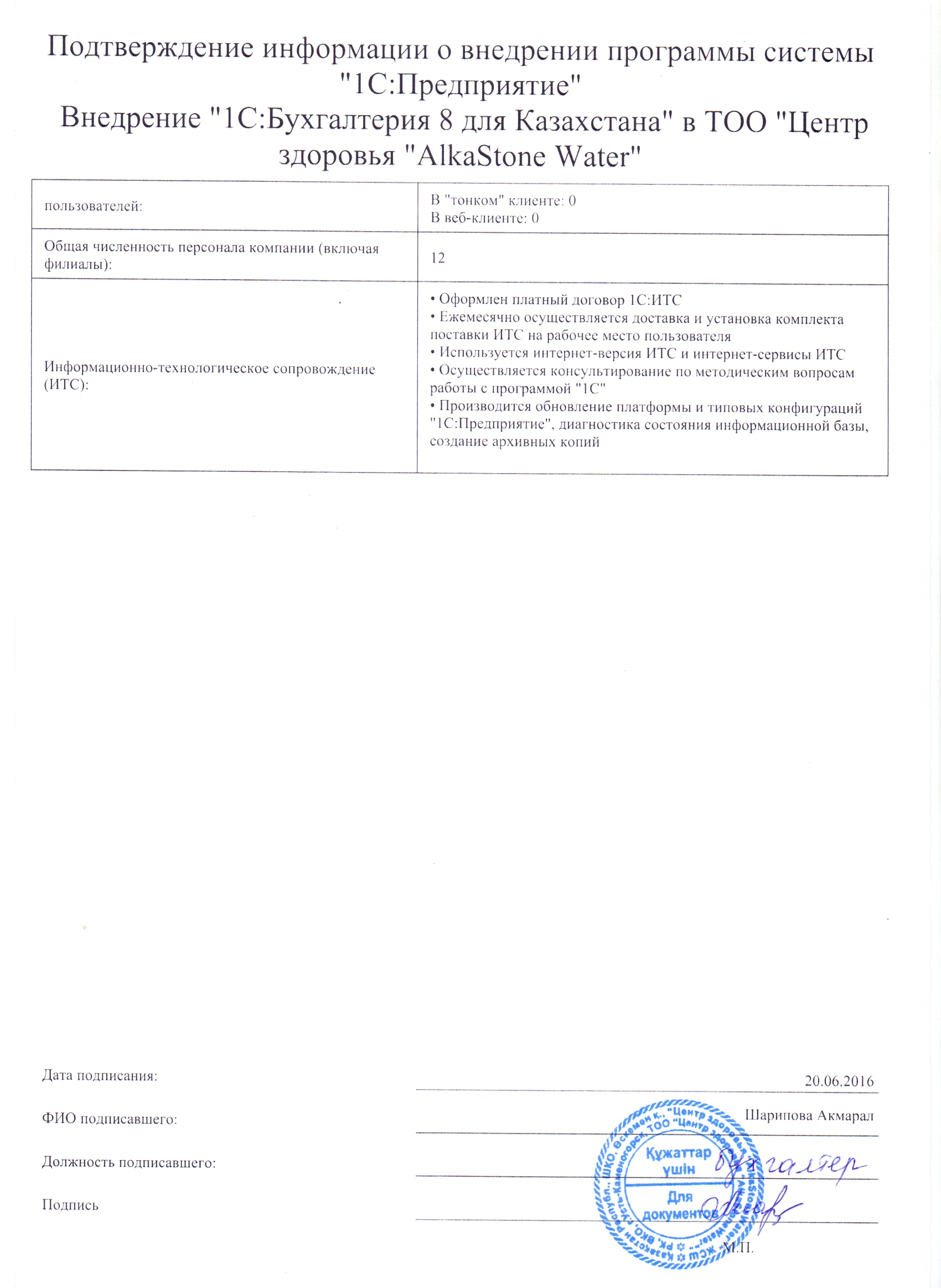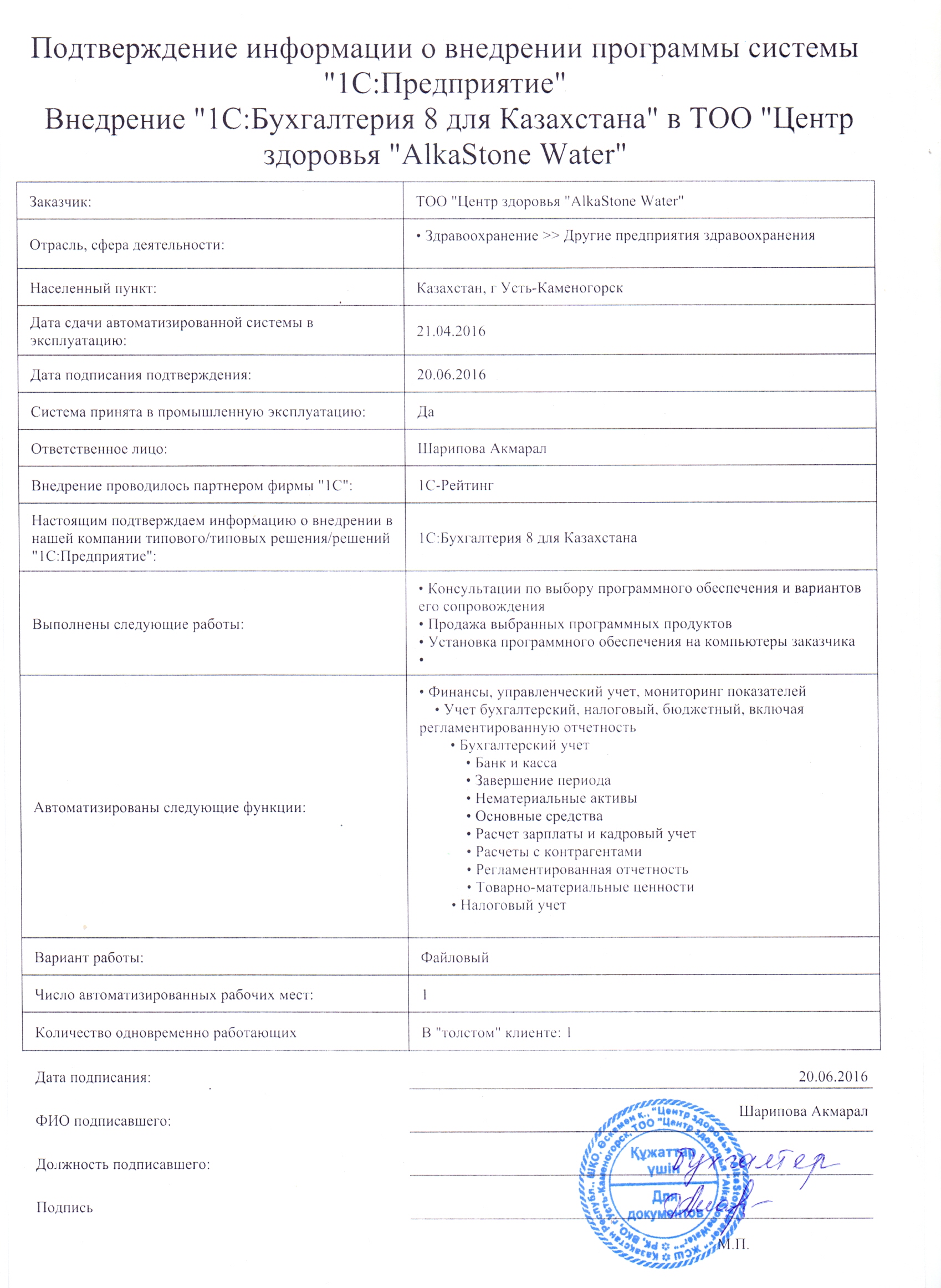 | Внедренное типовое решение: | 1С:Бухгалтерия 8 для Казахстан |