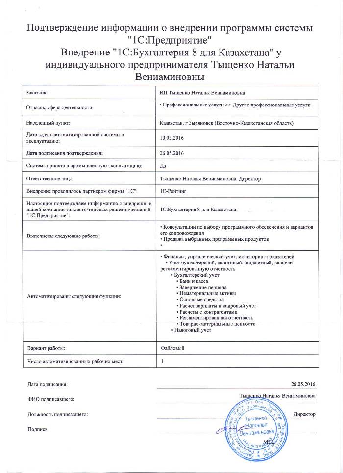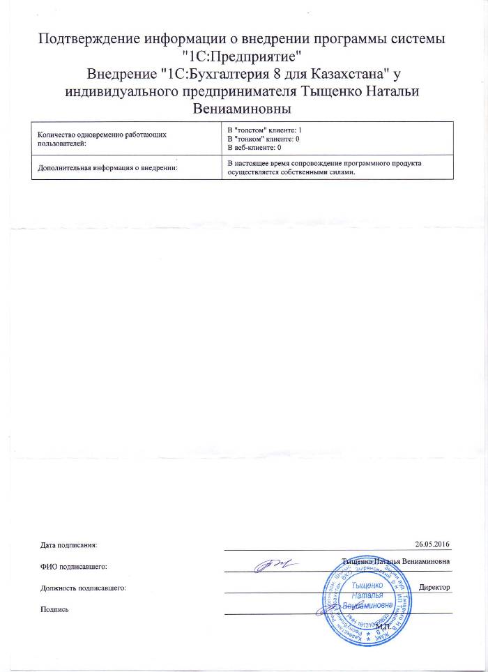 | Внедренное типовое решение: | 1С:Бухгалтерия 8 для Казахстана |
