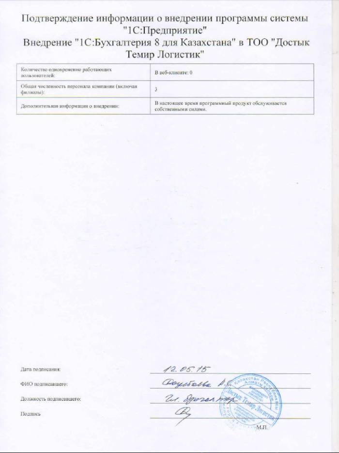| Внедренное типовое решение: | 1С:Бухгалтерия 8 для Казахстана |