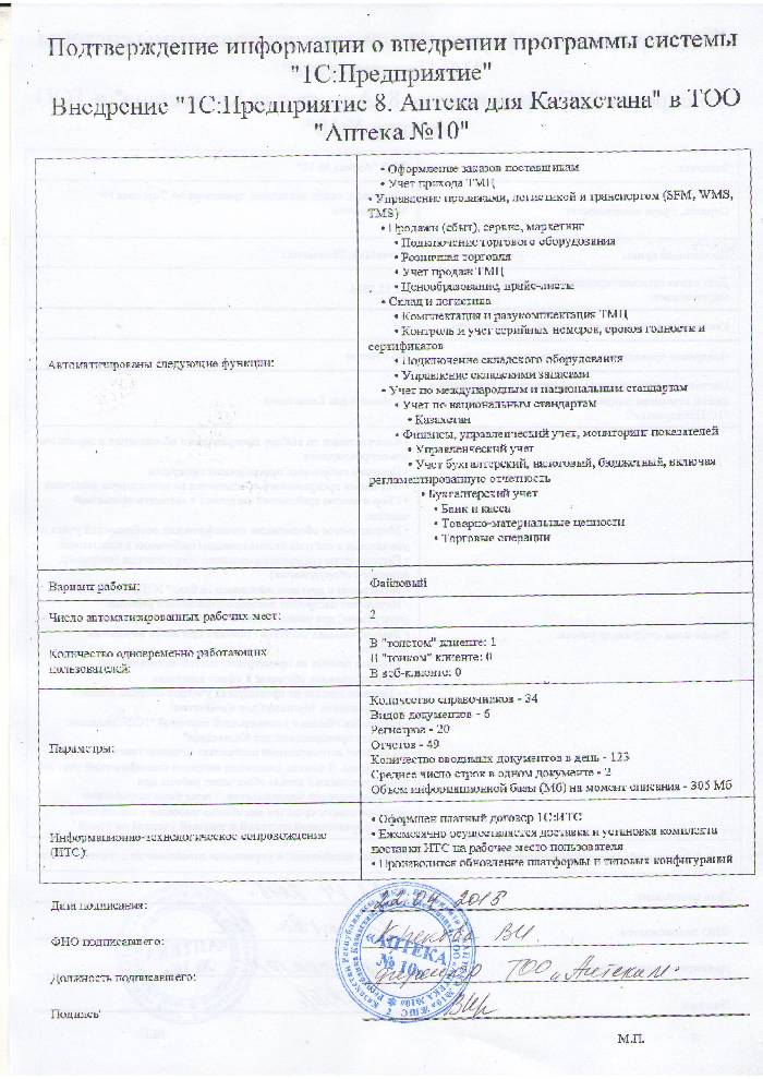 | Внедренное отраслевое решение: | 1С:Аптека для Казахстана |