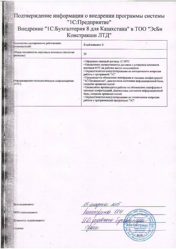 | Внедренное типовое решение: | 1С:Бухгалтерия 8 для Казахстана |