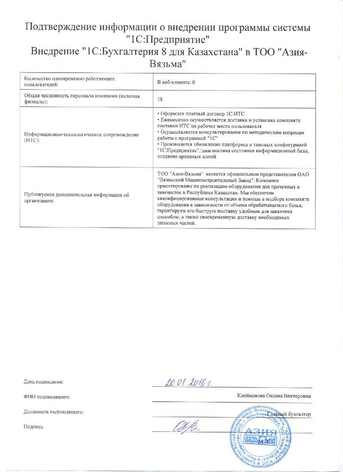 | Внедренное типовое решение: | 1С:Бухгалтерия 8 для Казахстана |