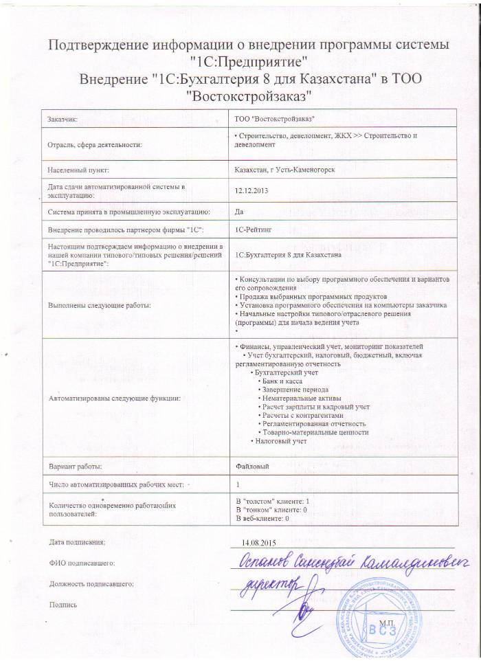 | Внедренное типовое решение: | 1С:Бухгалтерия 8 для Казахстана |