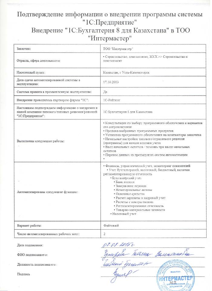 | Внедренное типовое решение: | 1С:Бухгалтерия 8 для Казахстана |