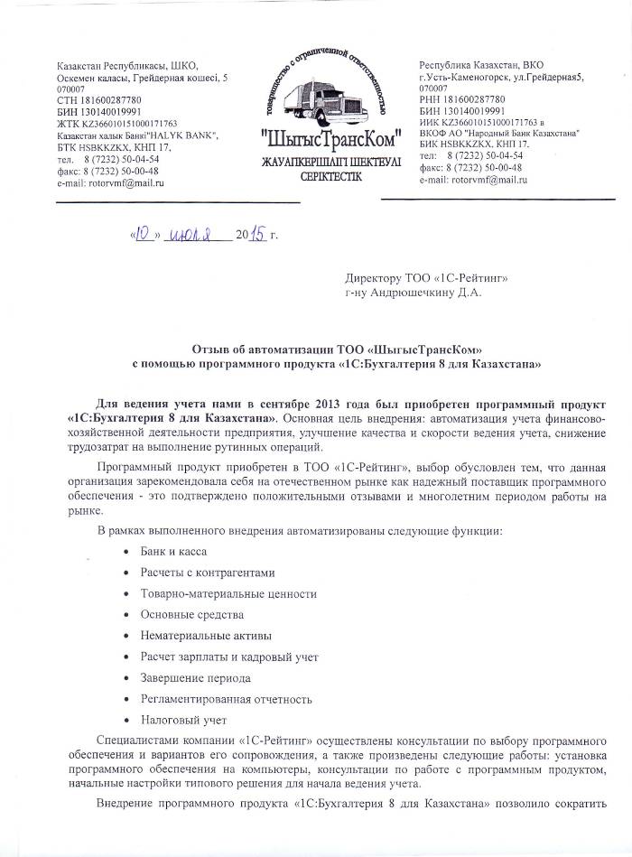 | Внедренное типовое решение: | 1С:Бухгалтерия 8 для Казахстана |