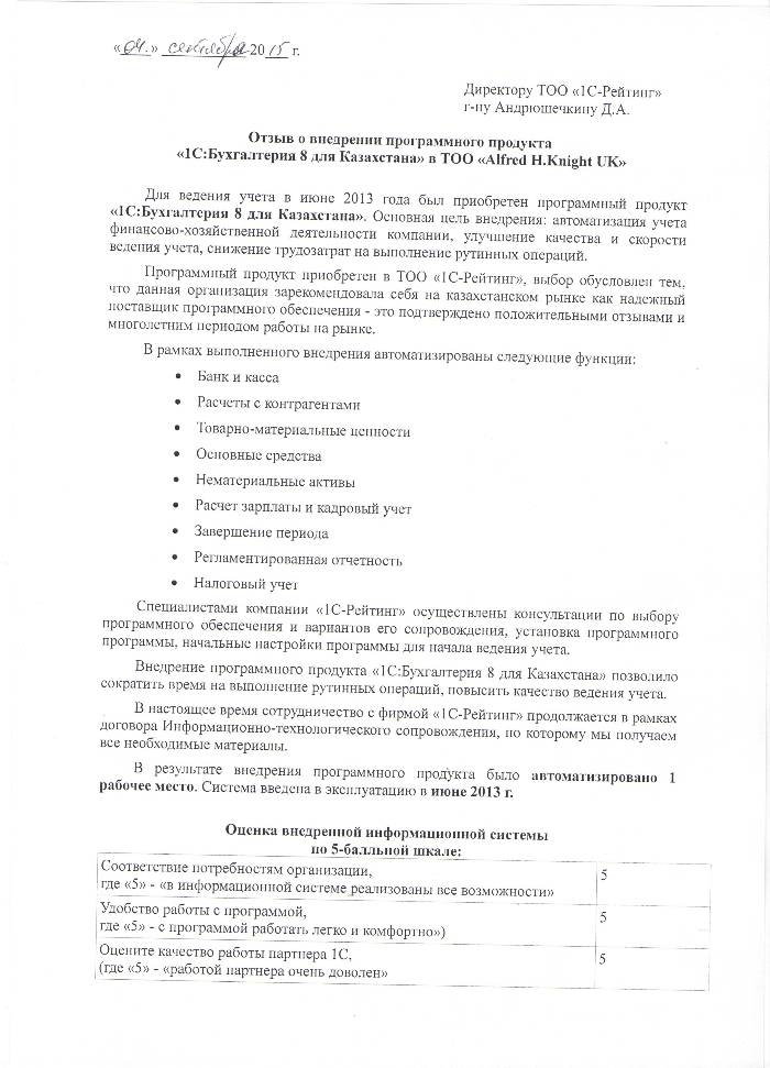 | Внедренное типовое решение: | 1С:Бухгалтерия 8 для Казахстана |