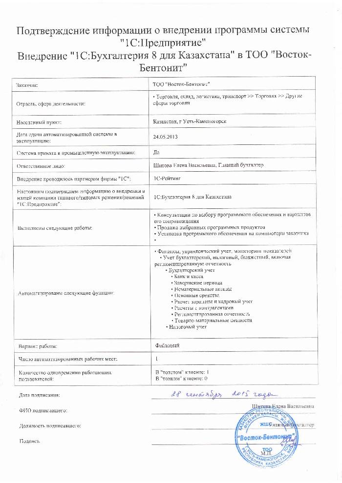 | Внедренное типовое решение: | 1С:Бухгалтерия 8 для Казахстана |
