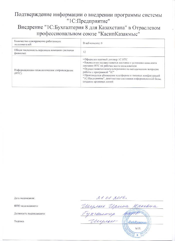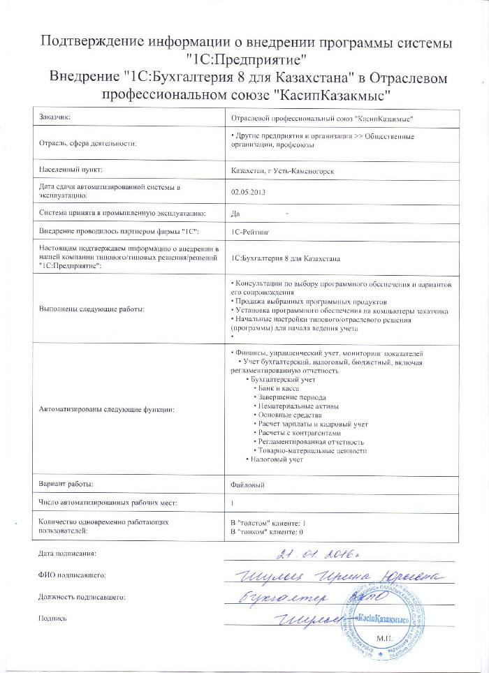 | Внедренное типовое решение: | 1С:Бухгалтерия 8 для Казахстана |