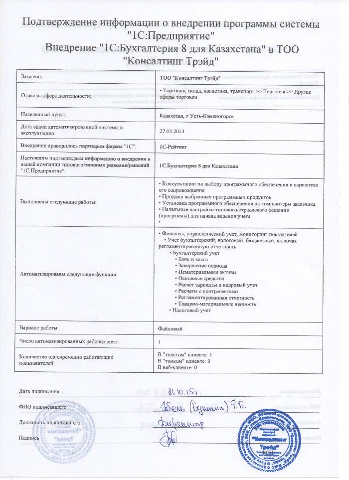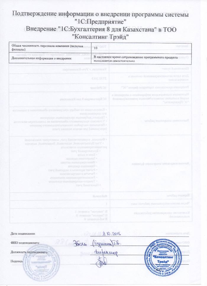 | Внедренное типовое решение: | 1С:Бухгалтерия 8 для Казахстана |