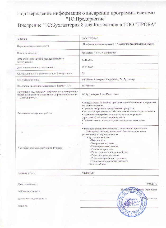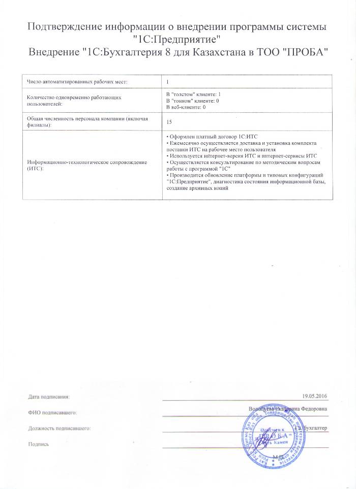 | Внедренное типовое решение: | 1С:Бухгалтерия 8 для Казахстана |