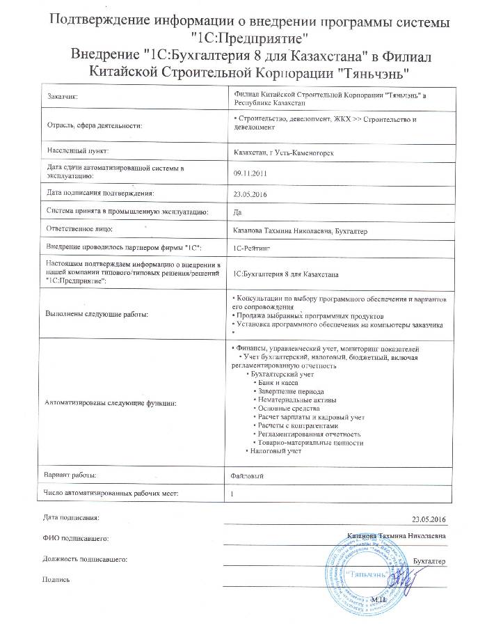 | Внедренное типовое решение: | 1С:Бухгалтерия 8 для Казахстана |
