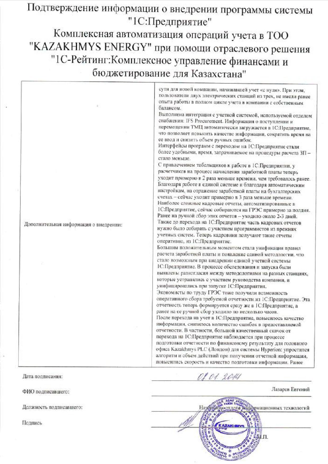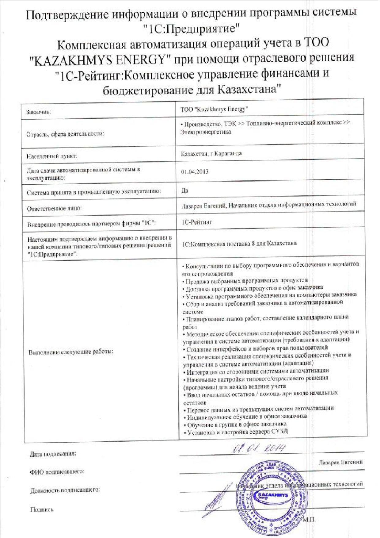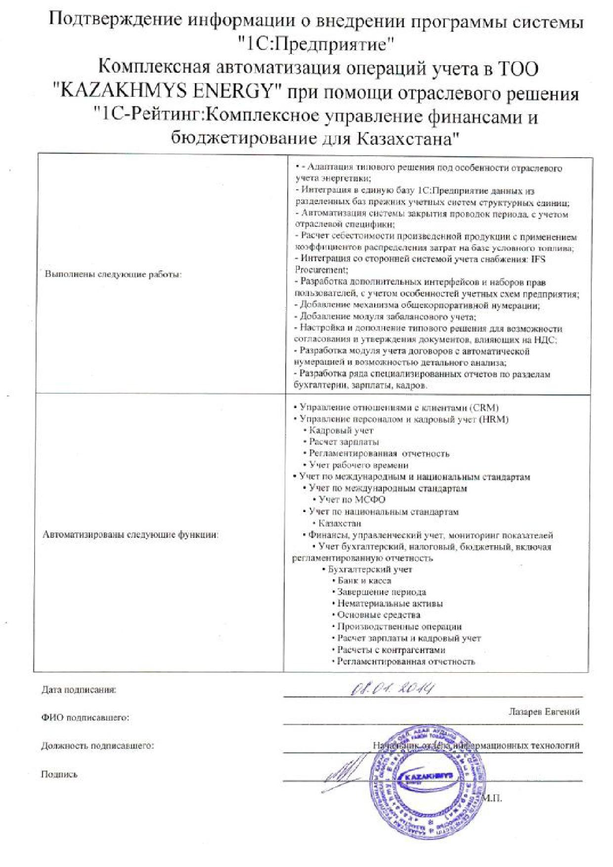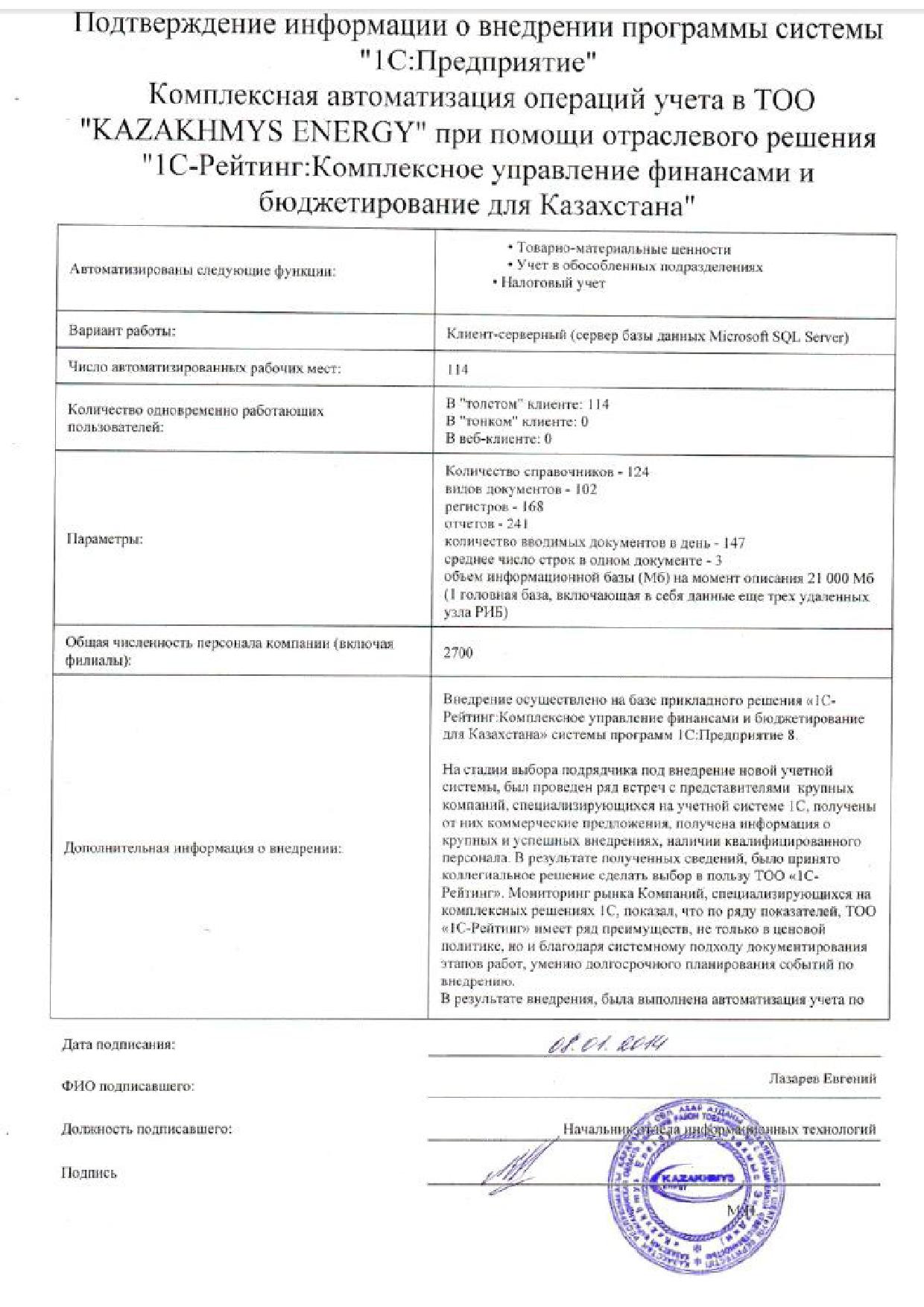 | Внедренное отраслевое решение: | 1С-Рейтинг: Комплексное управление финансами и бюджетирование для Казахстана |
