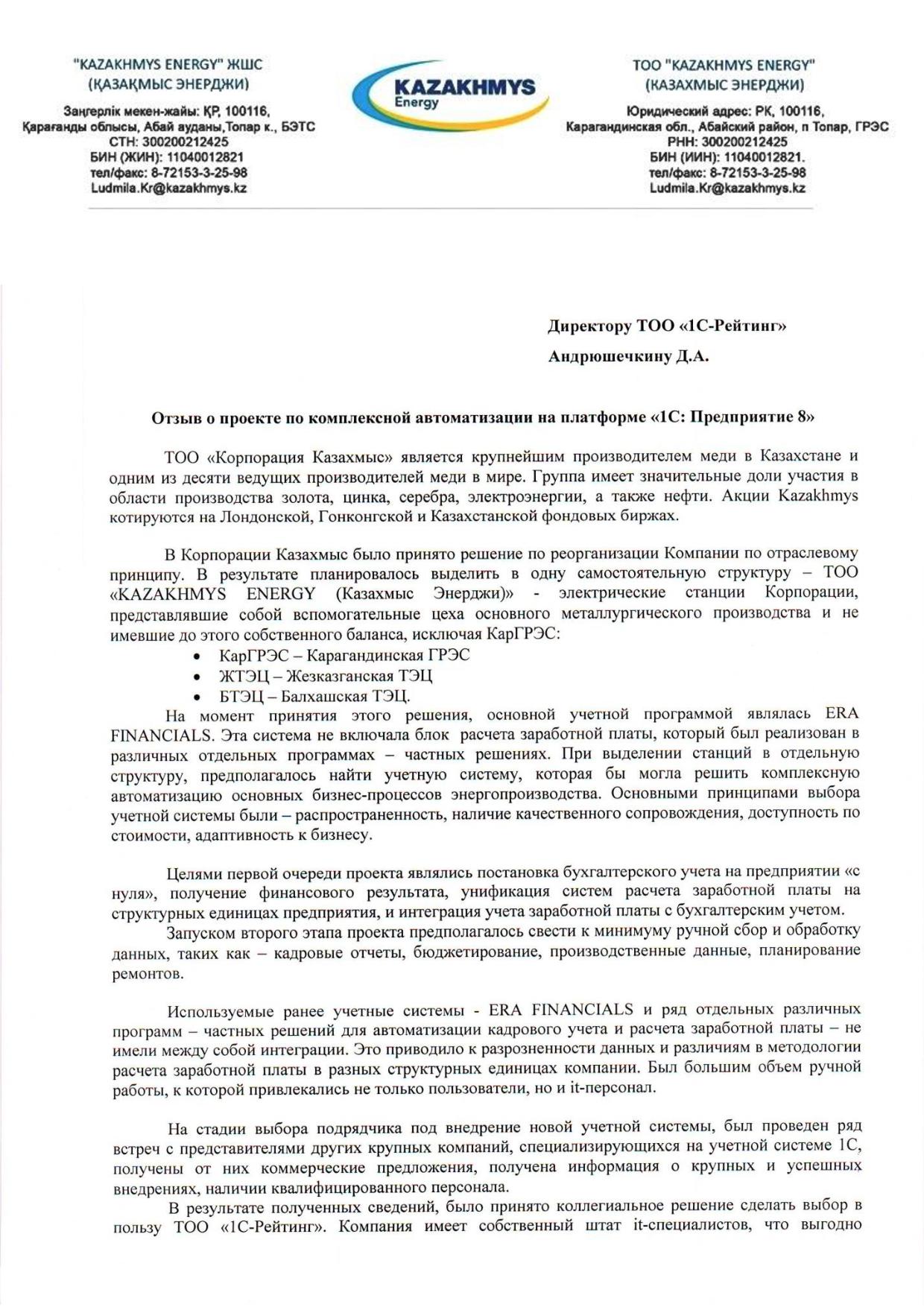 После перехода на учет в 1С:Предприятие, повысилось качество обрабатываемой информации, снизилось количество ошибок в предоставляемой отчетности. В частности, большой качественный скачок наблюдается при процессе подготовки отчетности по финансовому результату для головного офиса Kazakhmys PLC (Лондон) для системы Hyperion: упростился алгоритм и объем действий при получении отчетной информации, повысились скорость и качество подготовки информации. Ранее получение этой отчетности в нужных разрезах из учетных систем БТЭЦ, ЖТЭЦ, ГРЭС выполнялось за 5–8 рабочих дней, сейчас — за 1 рабочий день.