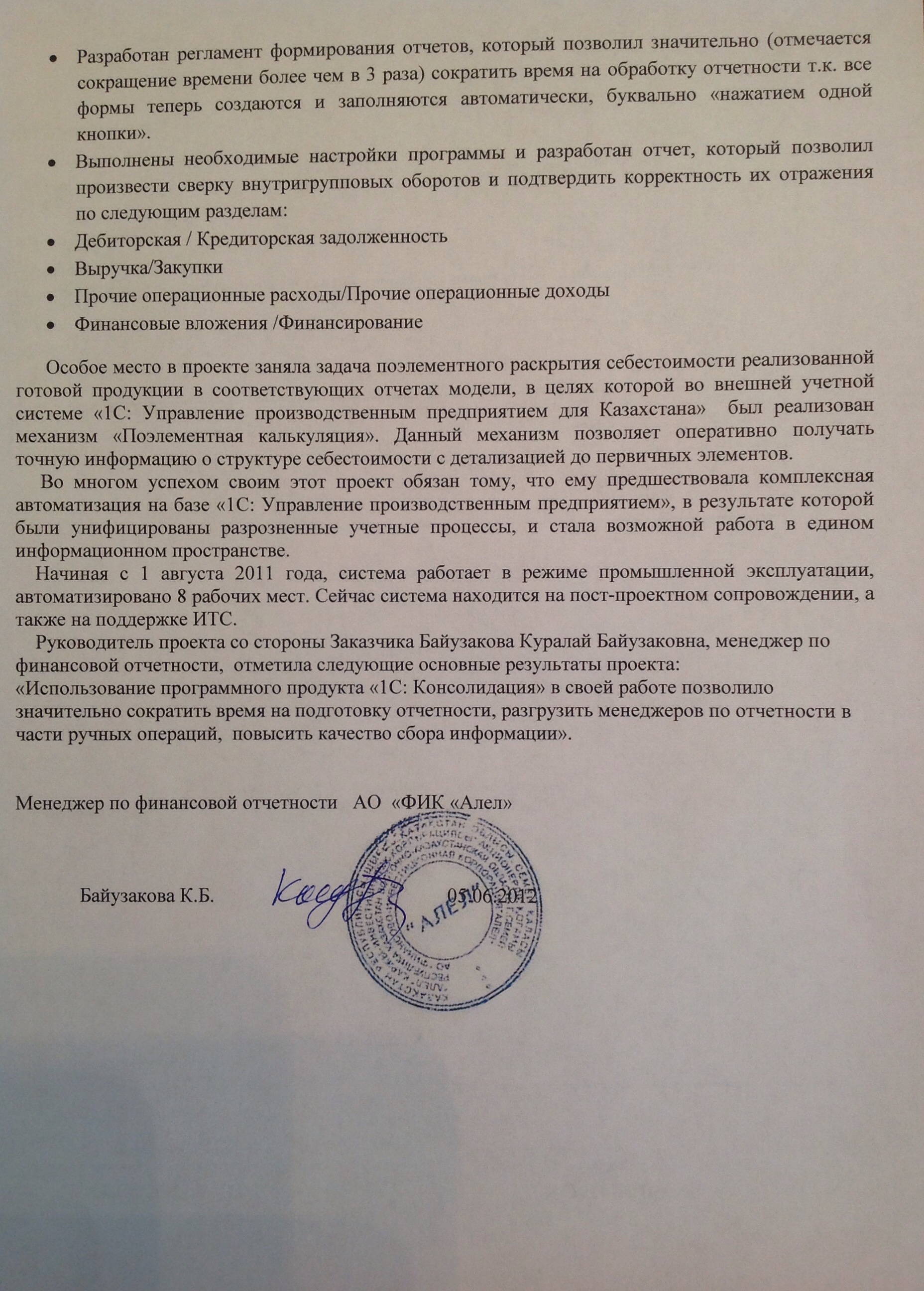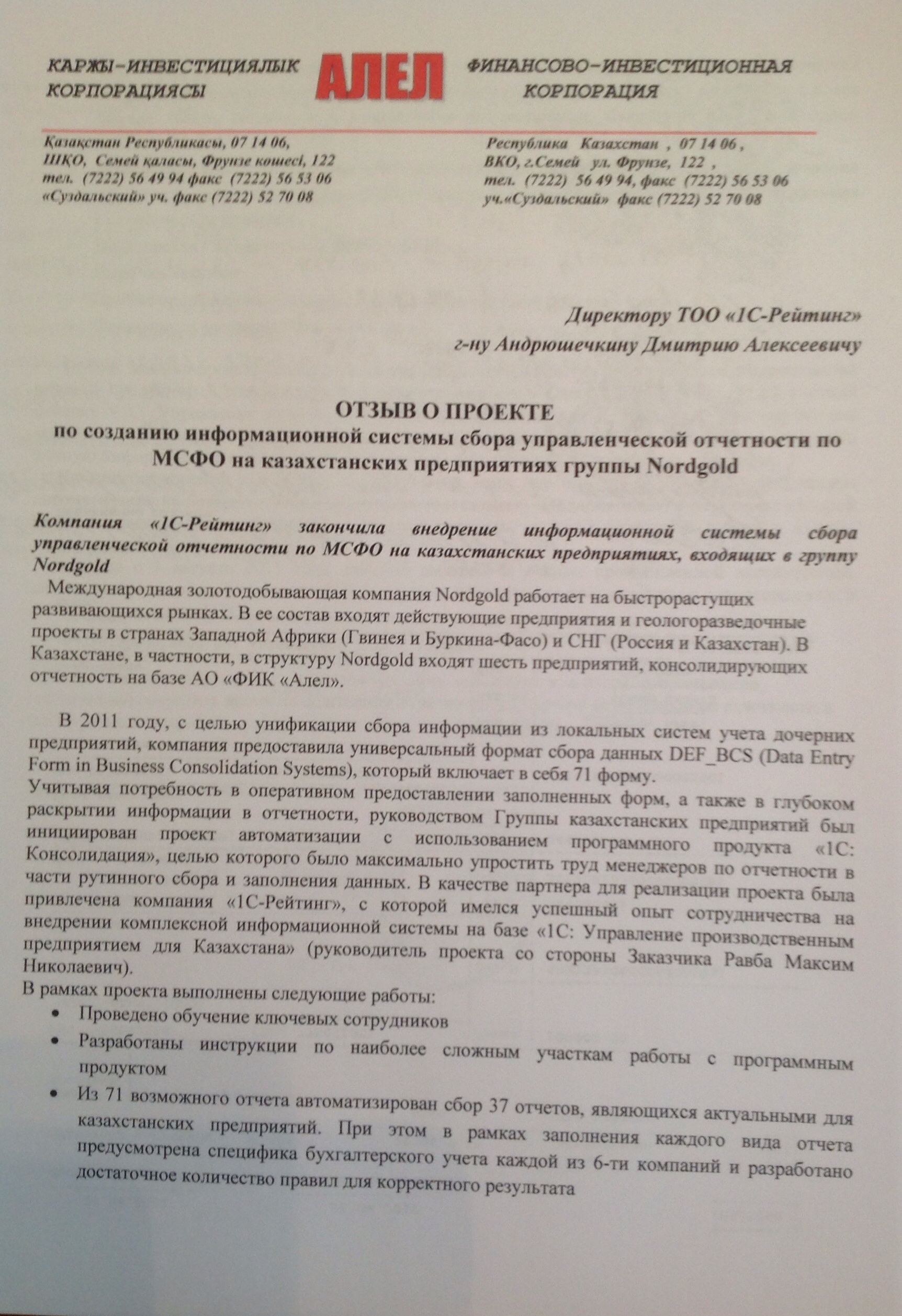 Учитывая потребность в оперативном предоставлении заполненных форм, а также в глубоком раскрытии информации в отчетности, руководством Группы казахстанских предприятий был инициирован проект автоматизации с использованием программного продукта «1С:Консолидация 8», целью которого было максимально упростить труд менеджеров по отчетности в части рутинного сбора и заполнения данных. В качестве партнера для реализации проекта была привлечена компания «1С-Рейтинг», с которой имелся успешный опыт сотрудничества на внедрении комплексной информационной системы на базе «1С:Управление производственным предприятием 8 для Казахстана» (руководитель проекта со стороны Заказчика Равба Максим Николаевич).