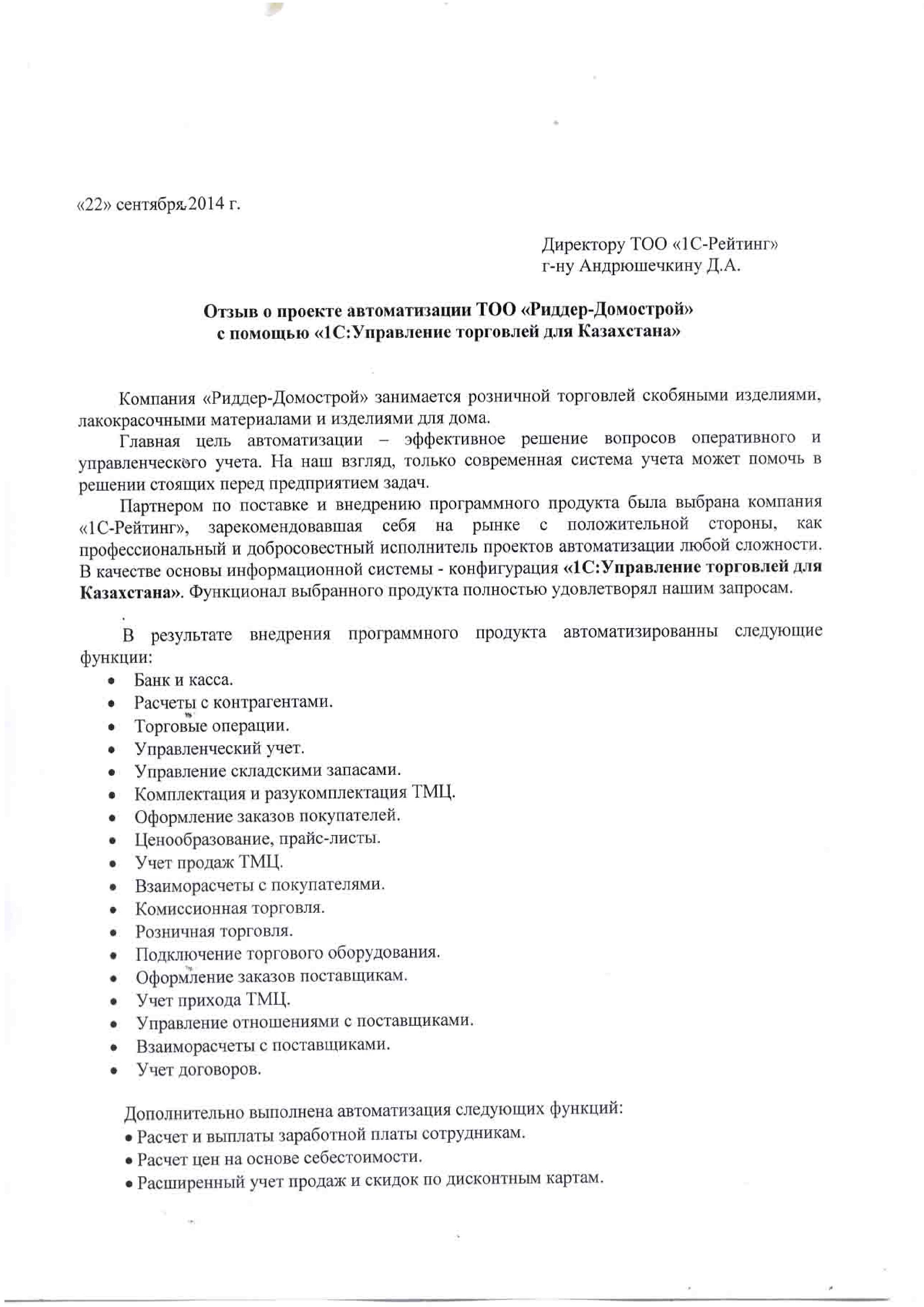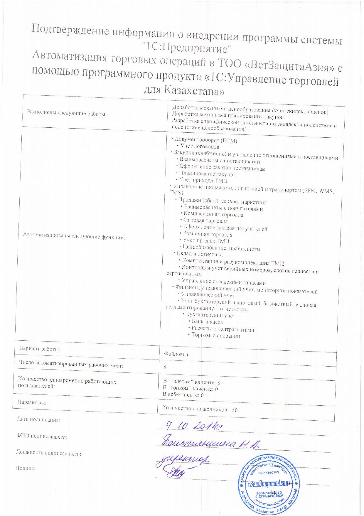 | Внедренное типовое решение: | 1С:Управление торговлей 8 для Казахстана |