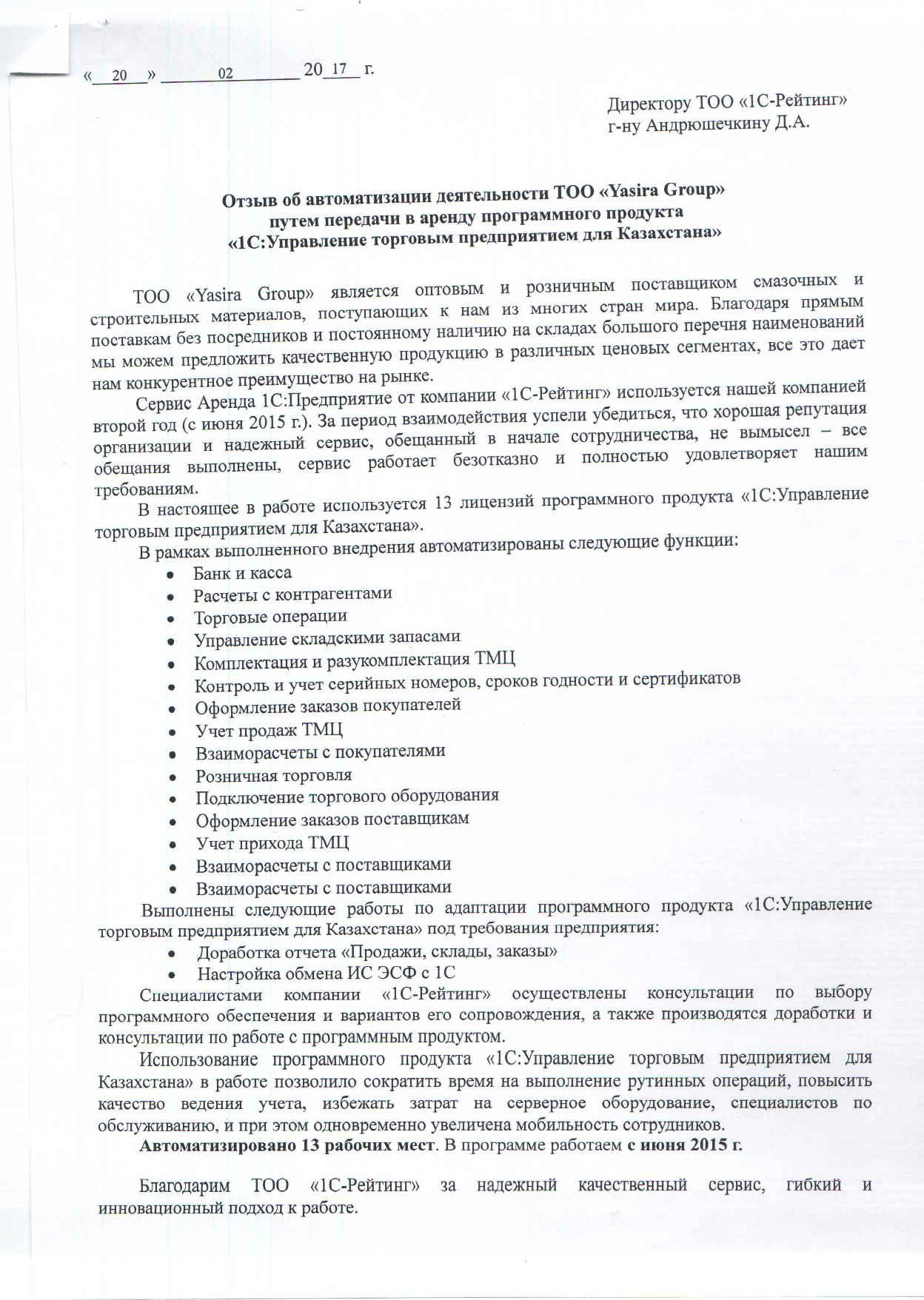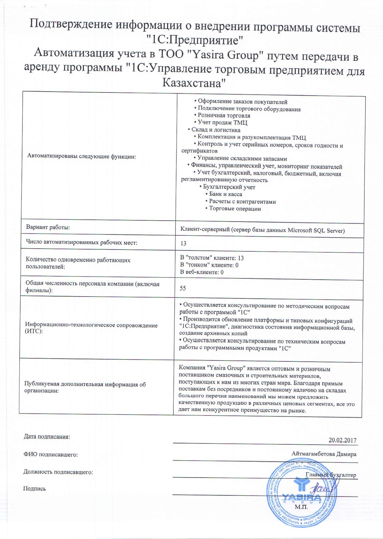 | Арендованное типовое решение: | 1С:Управление торговым предприятием для Казахстана |