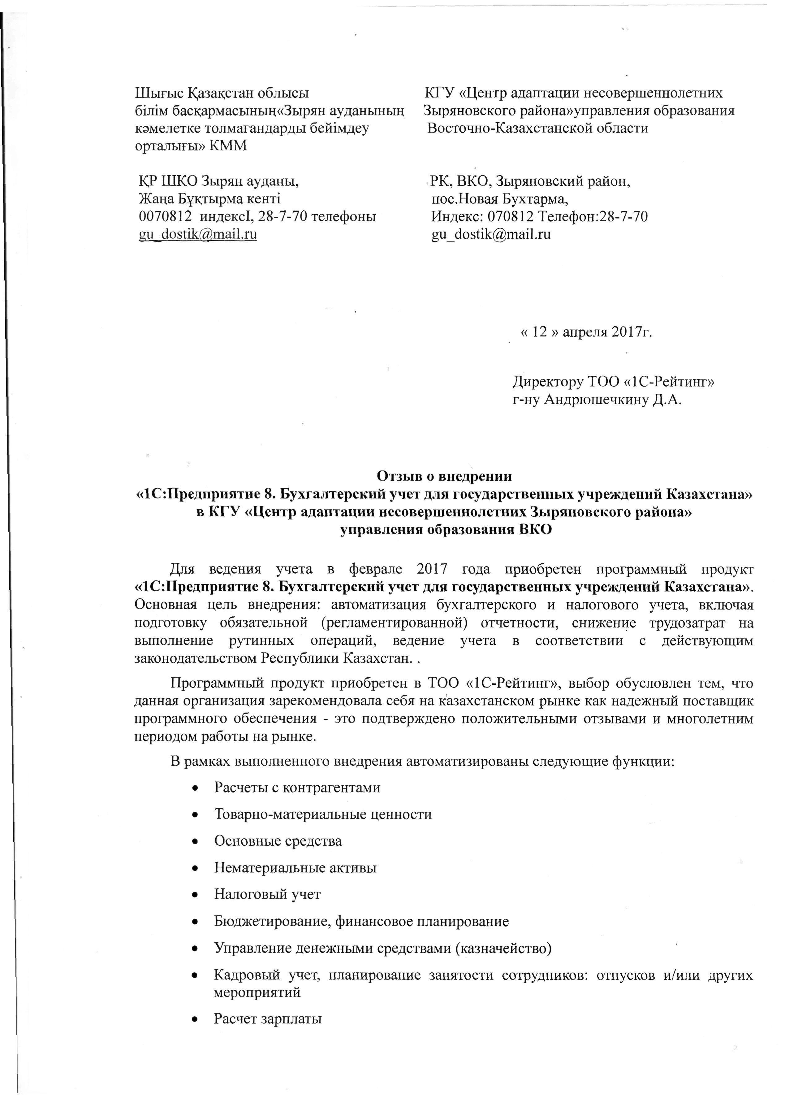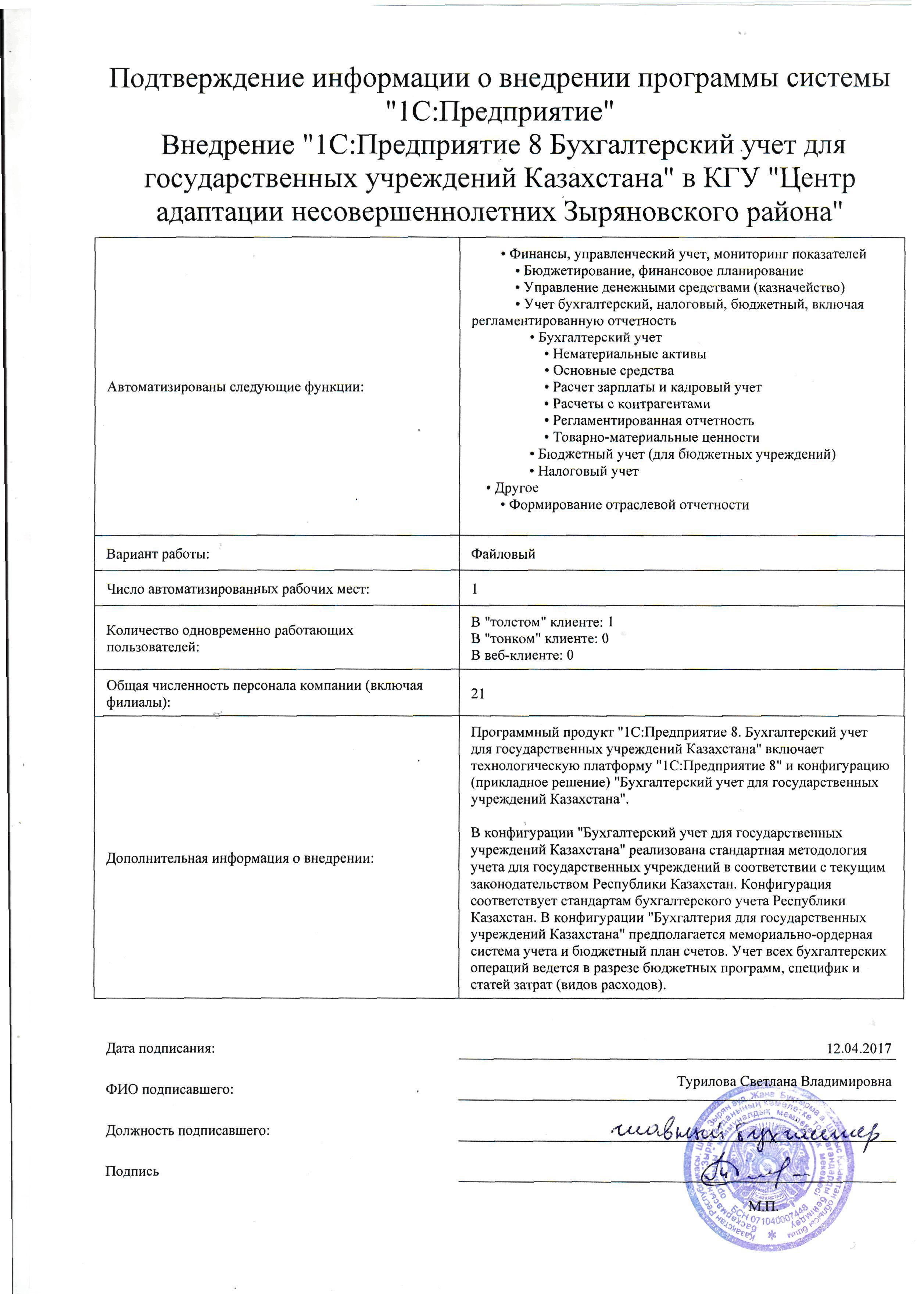 | Внедренное решение: | 1С:Бухгалтерский учет для государственных учреждений Казахстана |