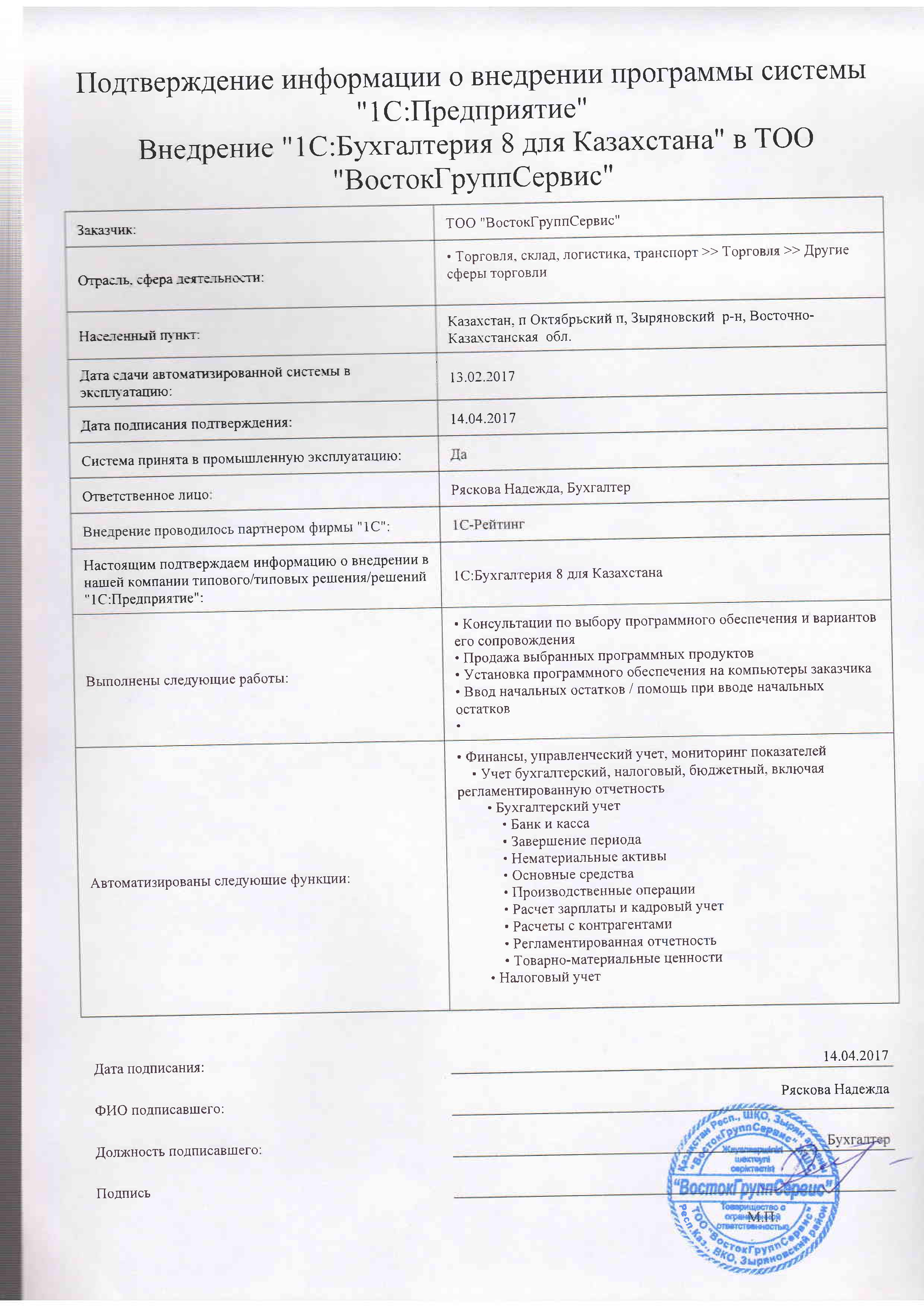| Внедренное типовое решение: | 1С:Бухгалтерия 8 для Казахстана |