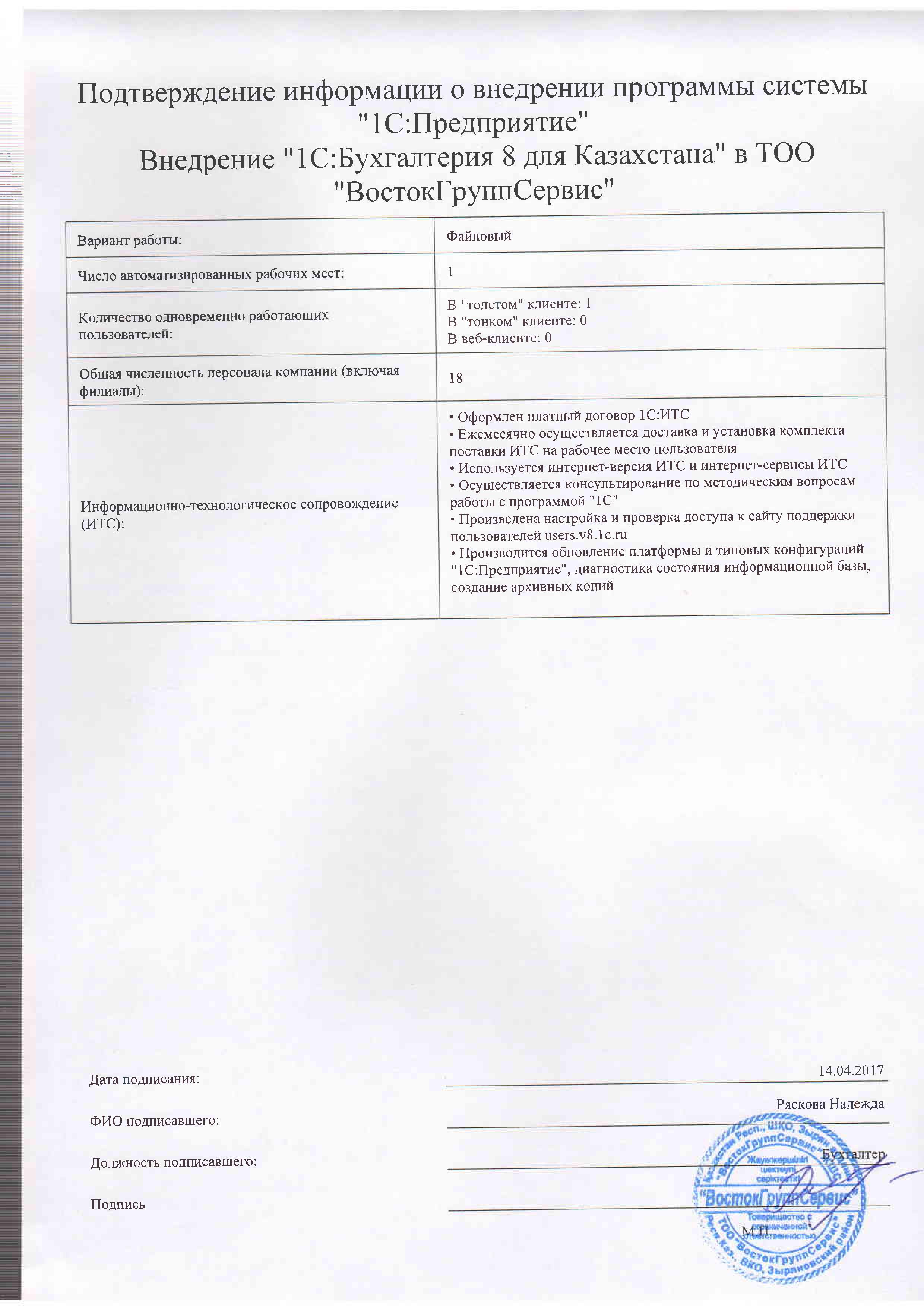 - Оформлен платный договор 1С:ИТС