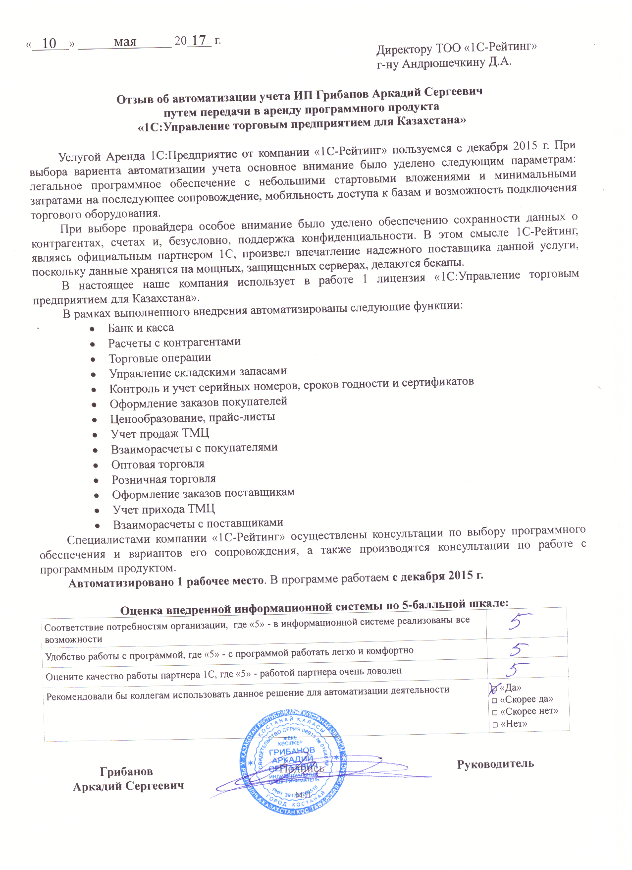 | Арендованное типовое решение: | 1С:Управление торговым предприятием для Казахстана |