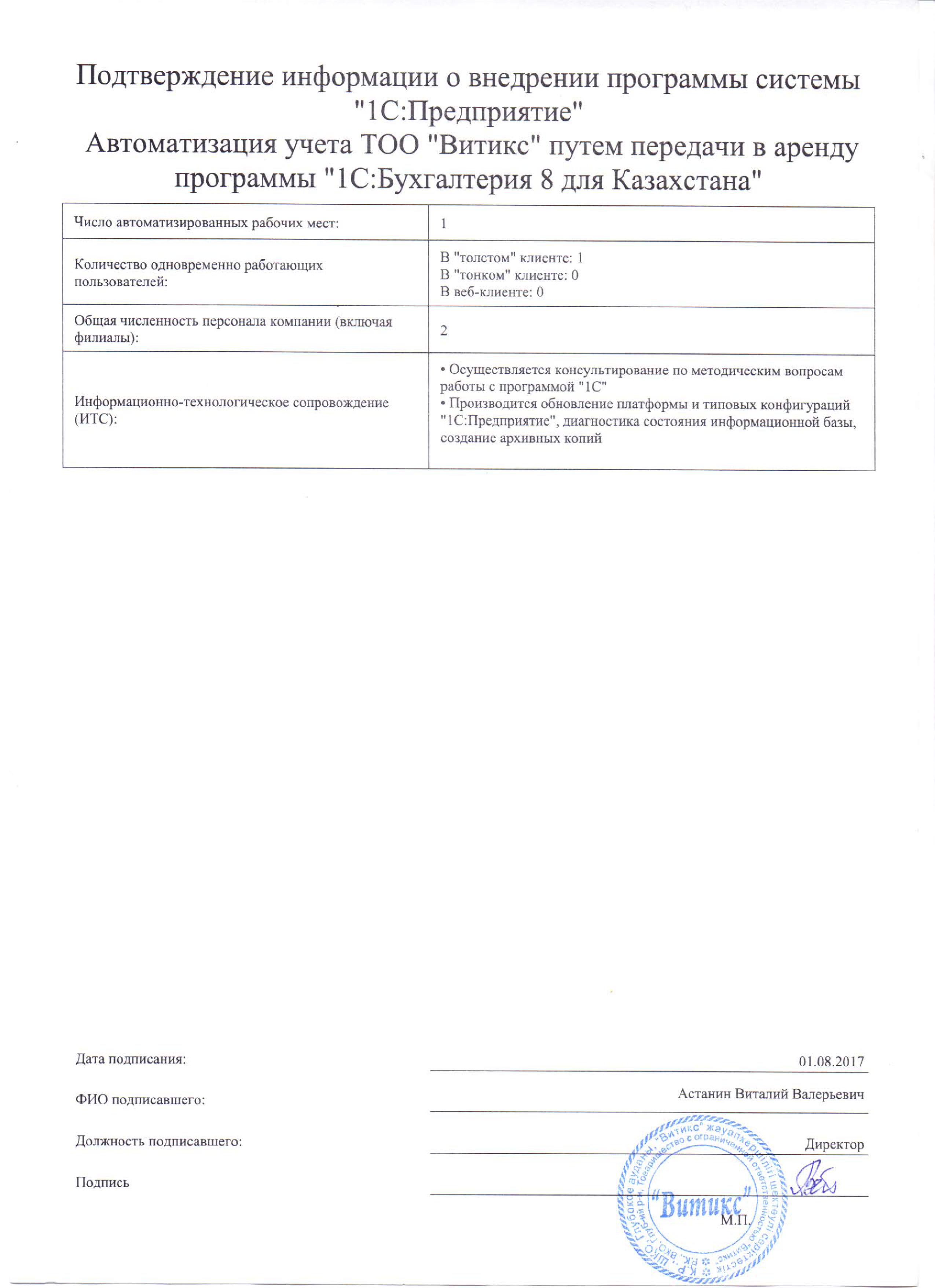 | Арендованное типовое решение: | 1С:Бухгалтерия для Казахстана |
