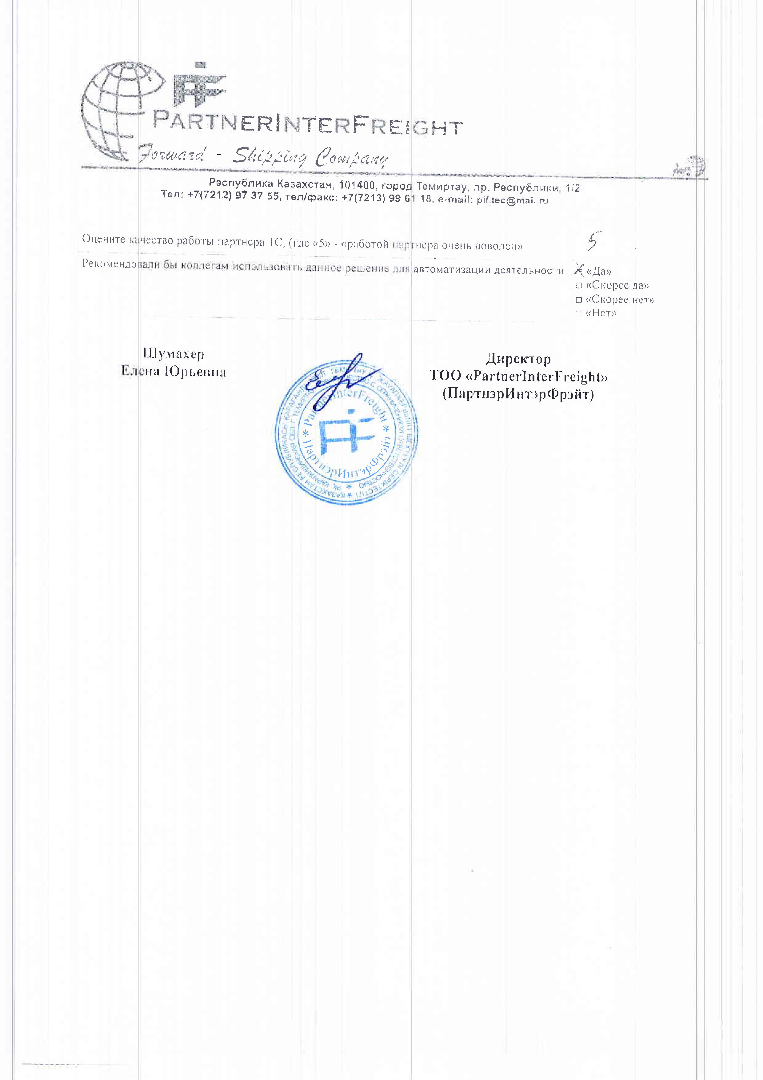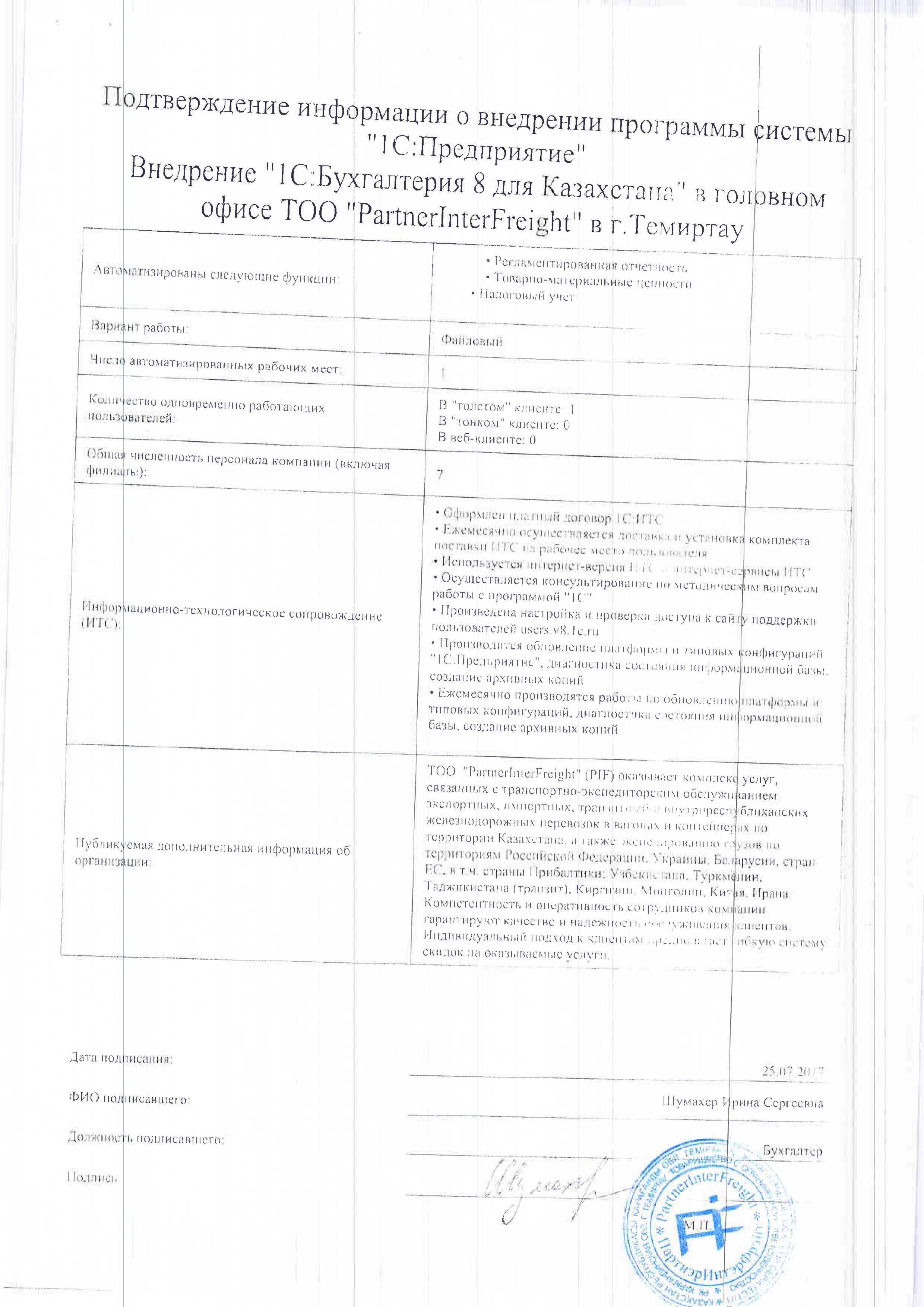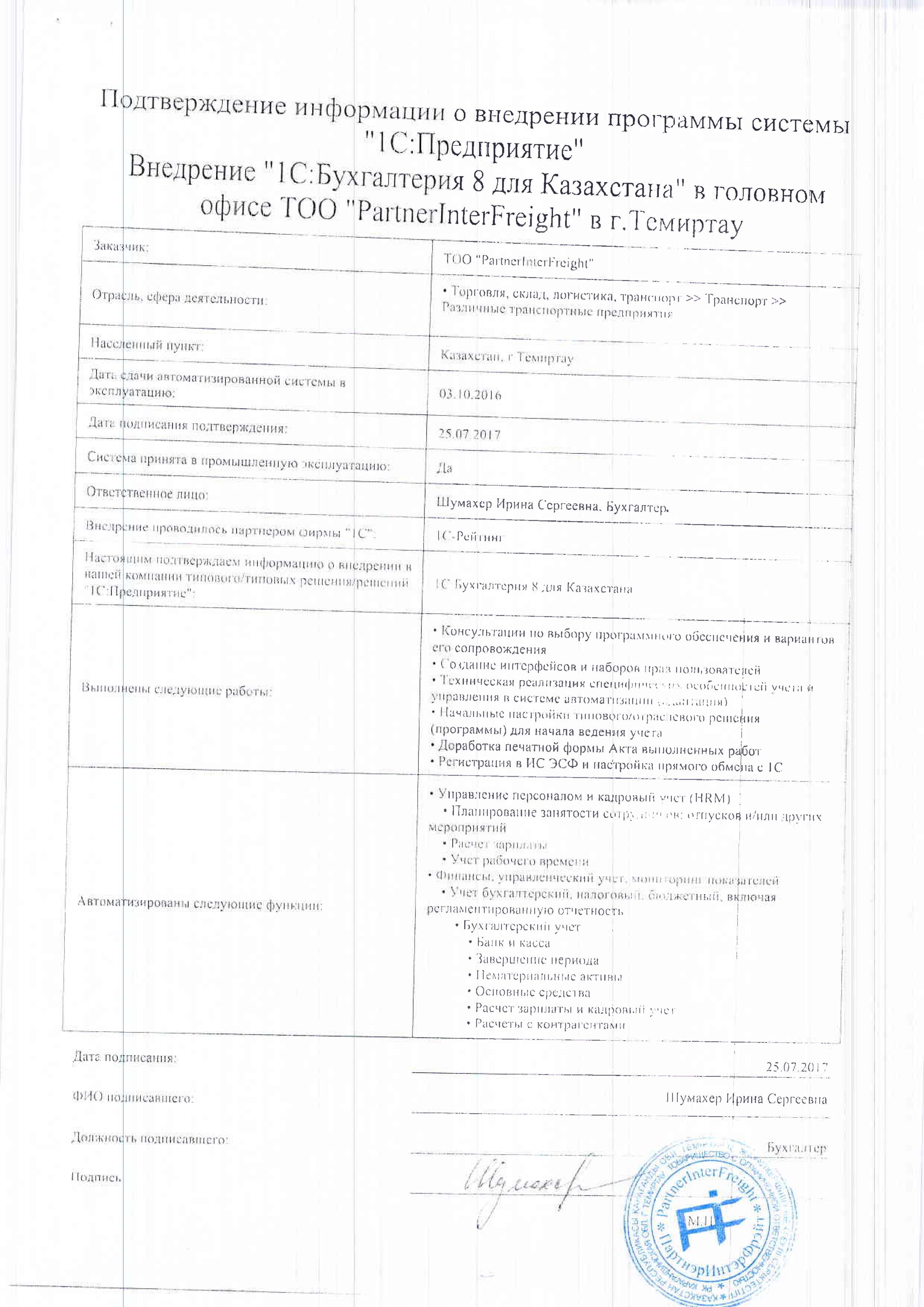 Внедрение «1С:Бухгалтерия 8 для Казахстана» в головном офисе ТОО «PartnerInterFreight» в г.Темиртау