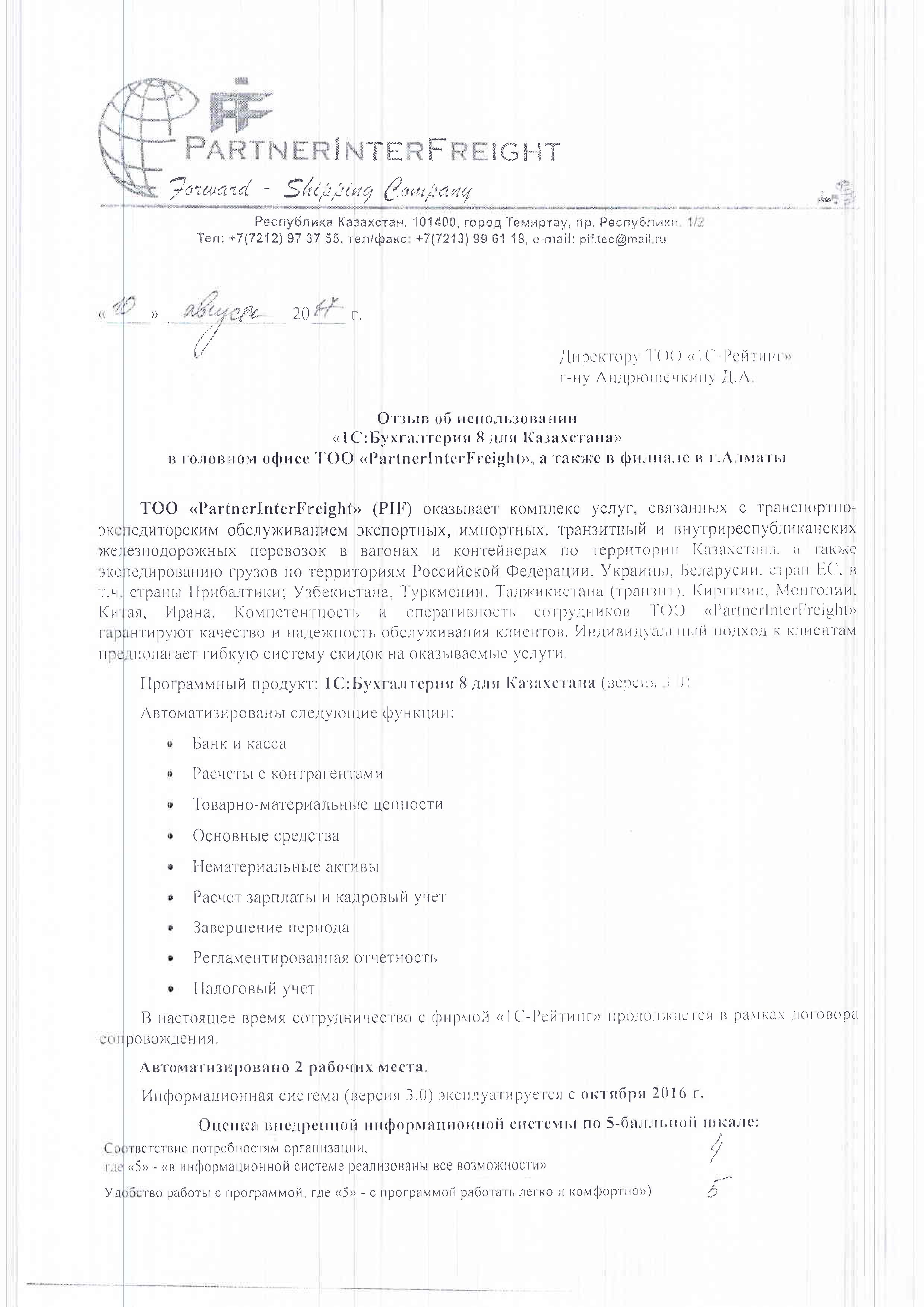 ТОО «PartnerInterFreight» (PIF) оказывает комплекс услуг, связанных с транспортно-экспедиторским обслуживанием экспортных, импортных, транзитный и внутриреспубликанских железнодорожных перевозок в вагонах и контейнерах по территории Казахстана, а также экспедированию грузов по территориям Российской Федерации, Украины, Беларусии, стран ЕС, в т.ч. страны Прибалтики; Узбекистана, Туркмении, Таджикистана (транзит), Киргизии, Монголии, Китая, Ирана. Компетентность и оперативность сотрудников компании гарантируют качество и надежность обслуживания клиентов. Индивидуальный подход к клиентам предполагает гибкую систему скидок на оказываемые услуги.