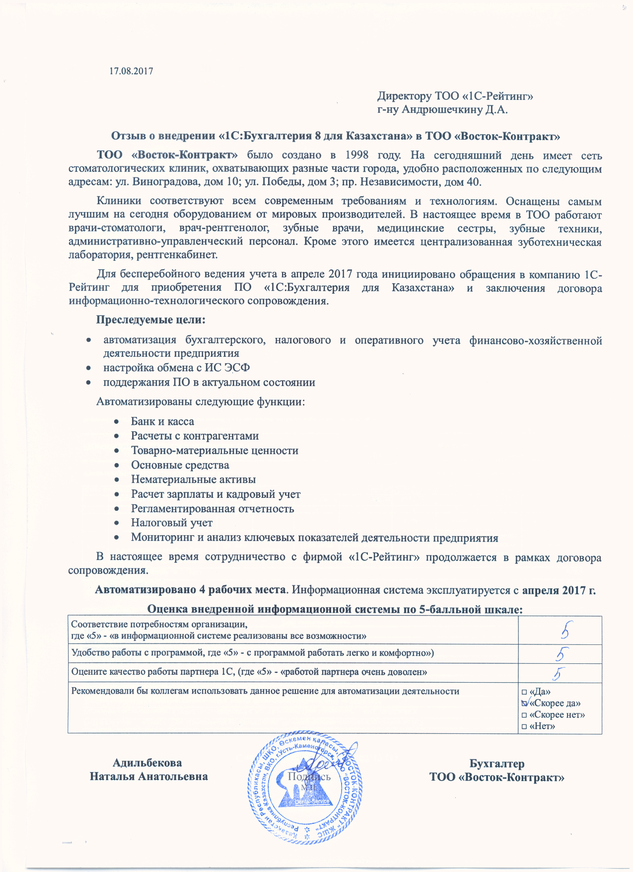 | Внедренное типовое решение: | 1С:Бухгалтерия 8 для Казахстана |
