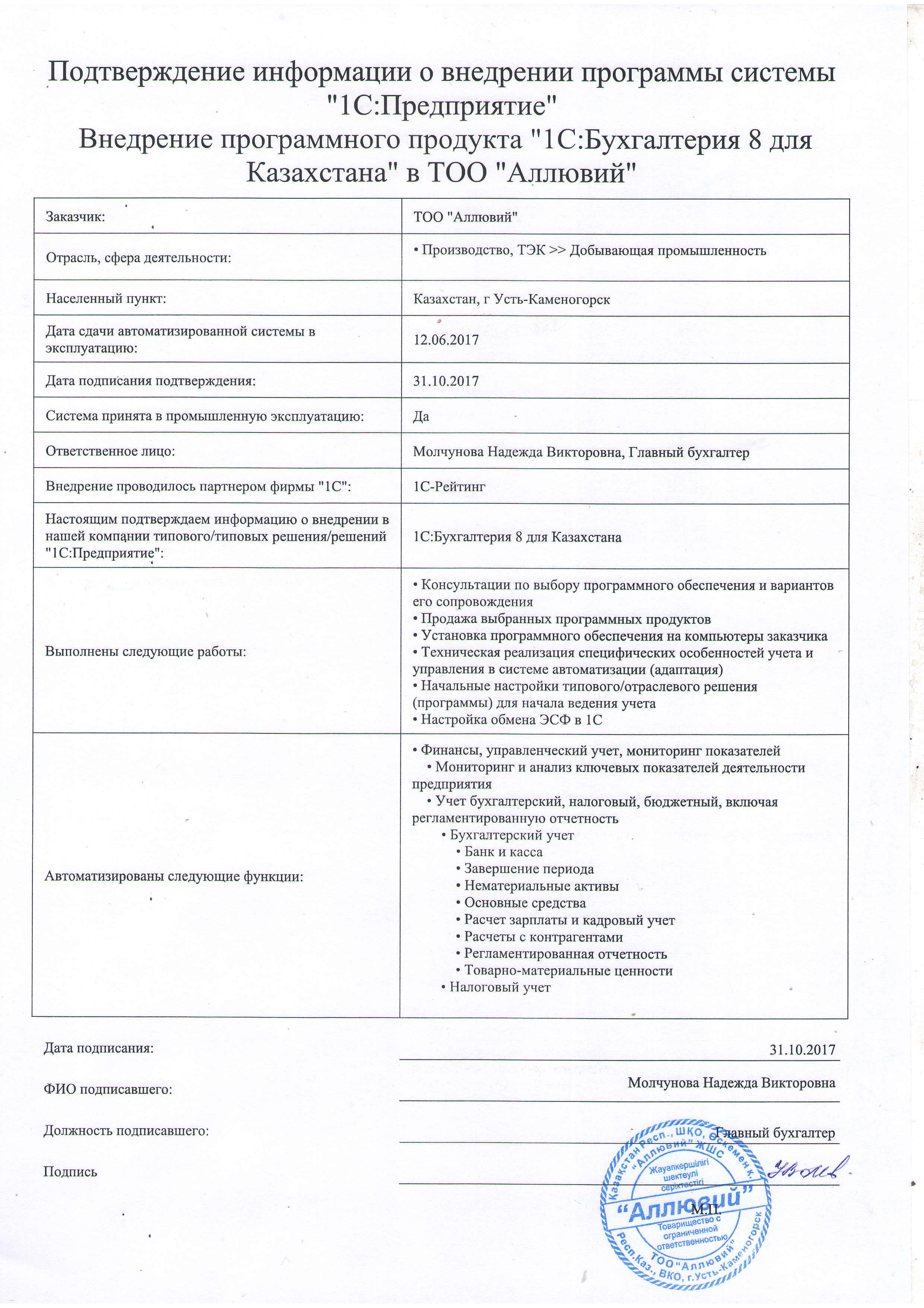 | Внедренное типовое решение: | 1С:Бухгалтерия 8 для Казахстана |