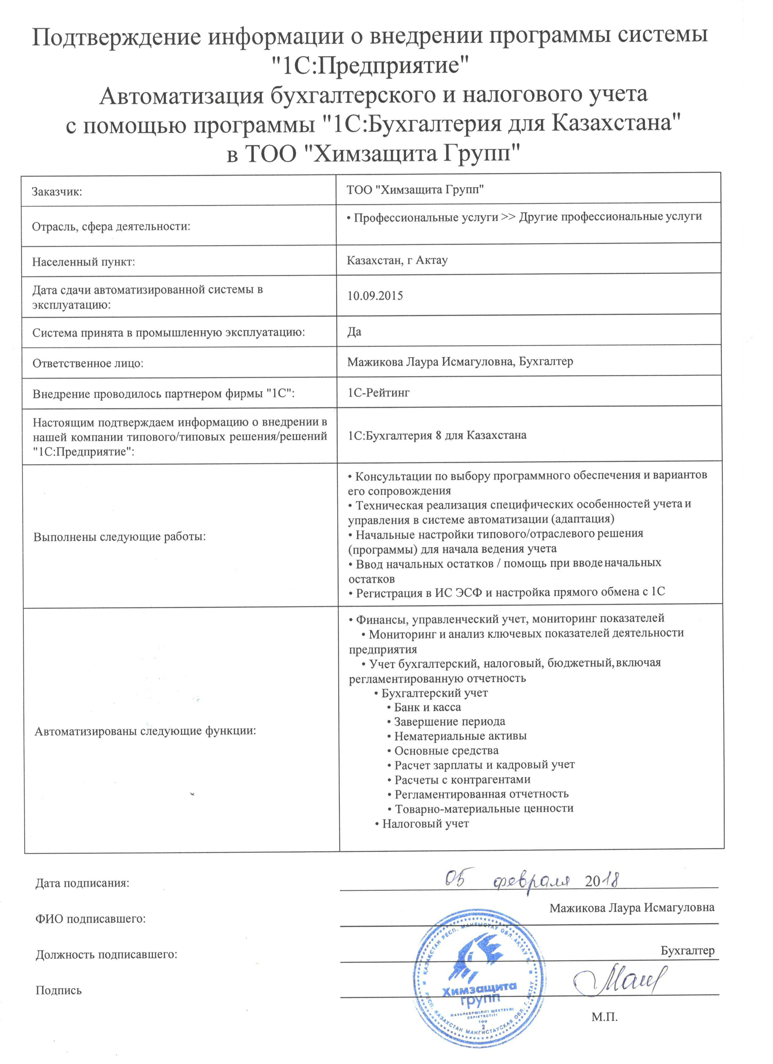 | Внедренное типовое решение: | 1С:Бухгалтерия 8 для Казахстана |