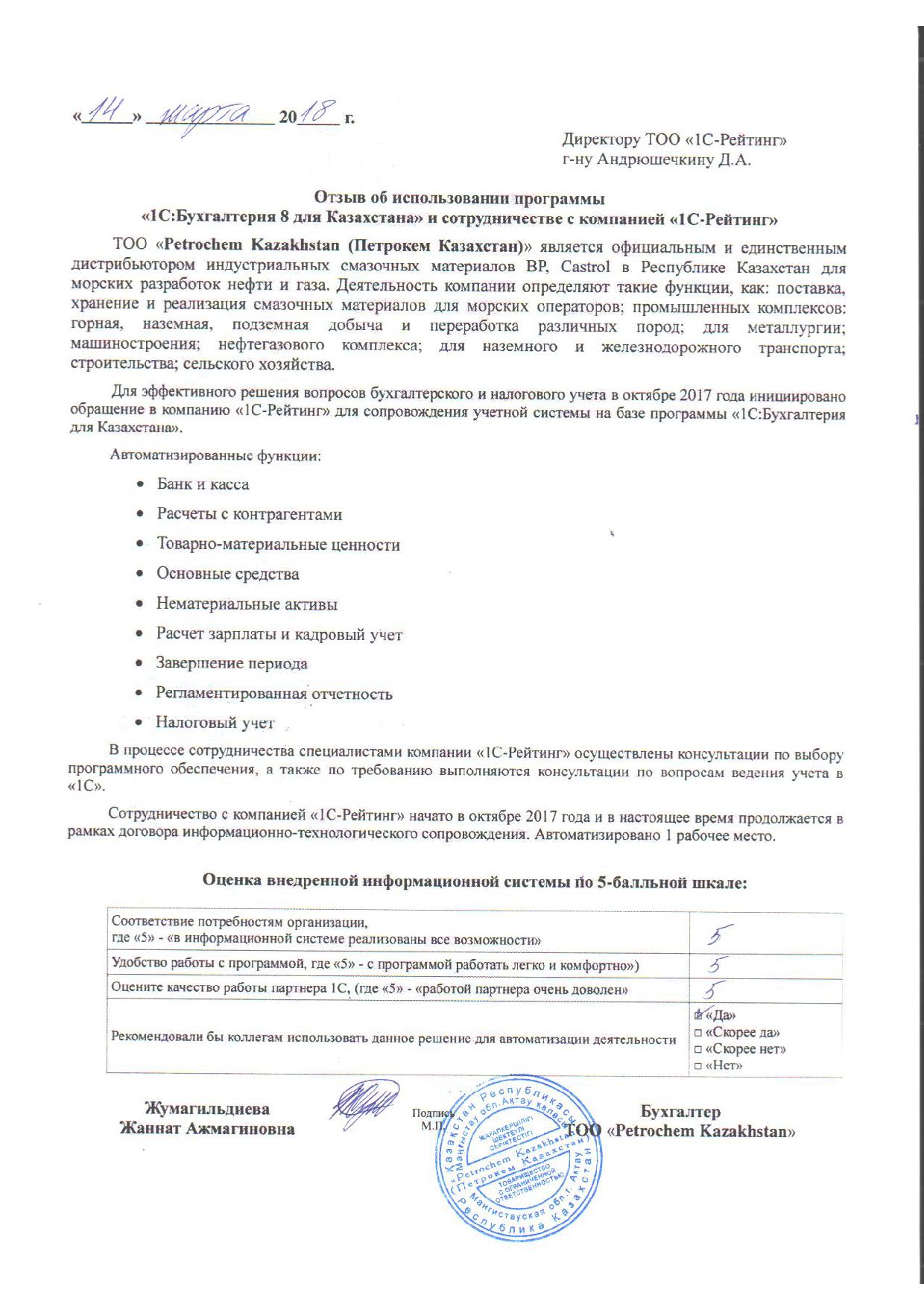 | Внедренное типовое решение: | 1С:Бухгалтерия для Казахстана |