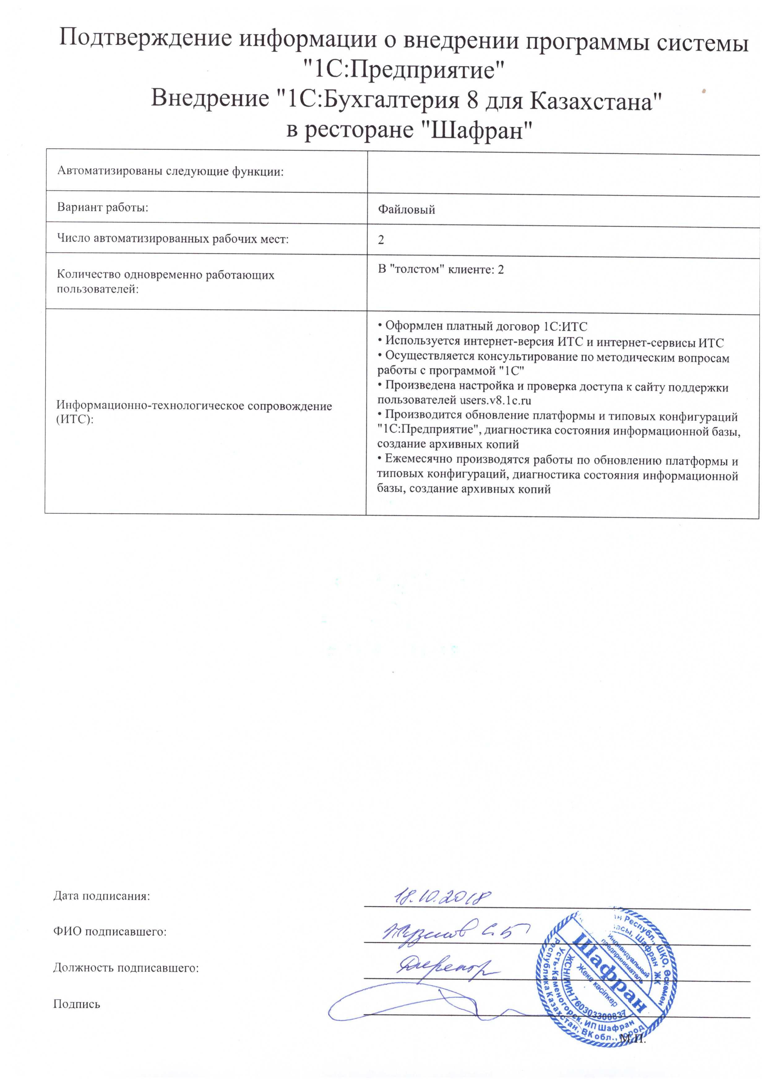 - Оформлен платный договор 1С:ИТС