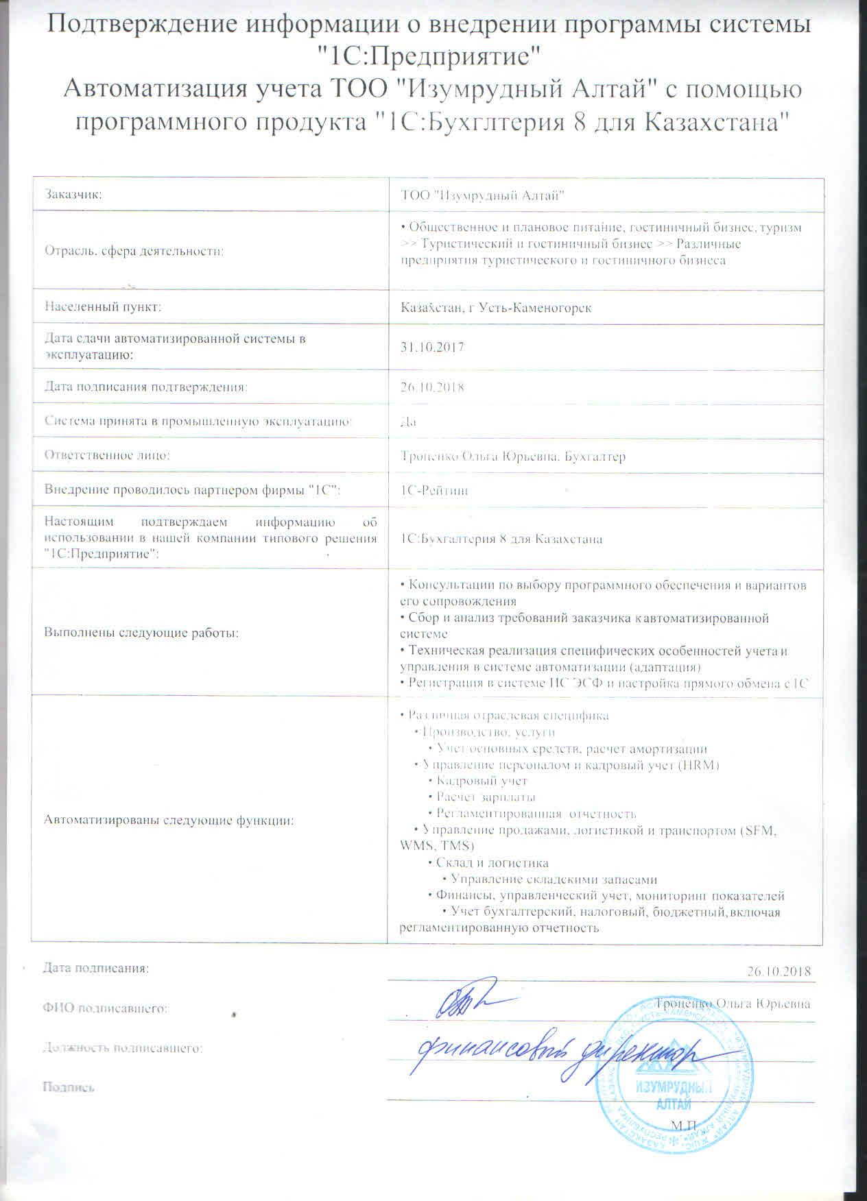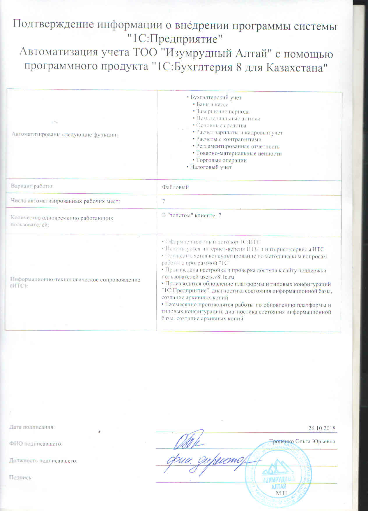 | Внедренное типовое решение: | 1С:Бухгалтерия 8 для Казахстана |