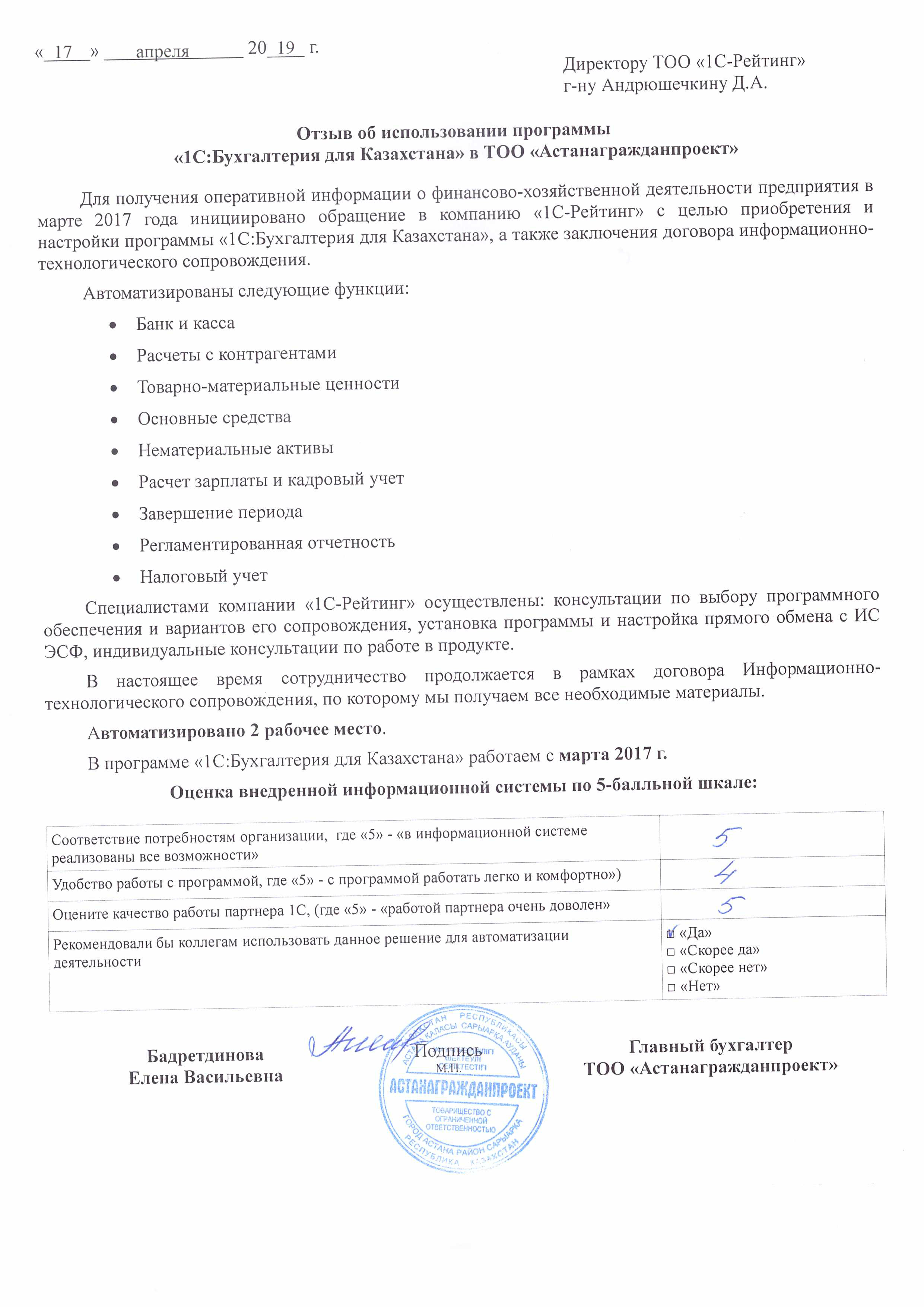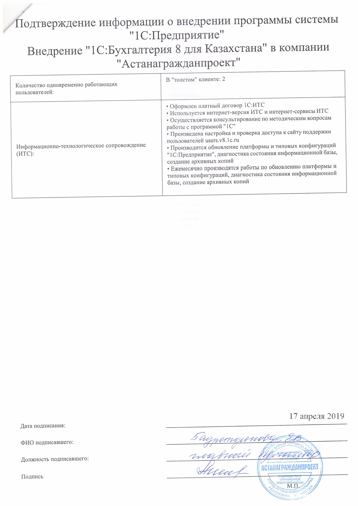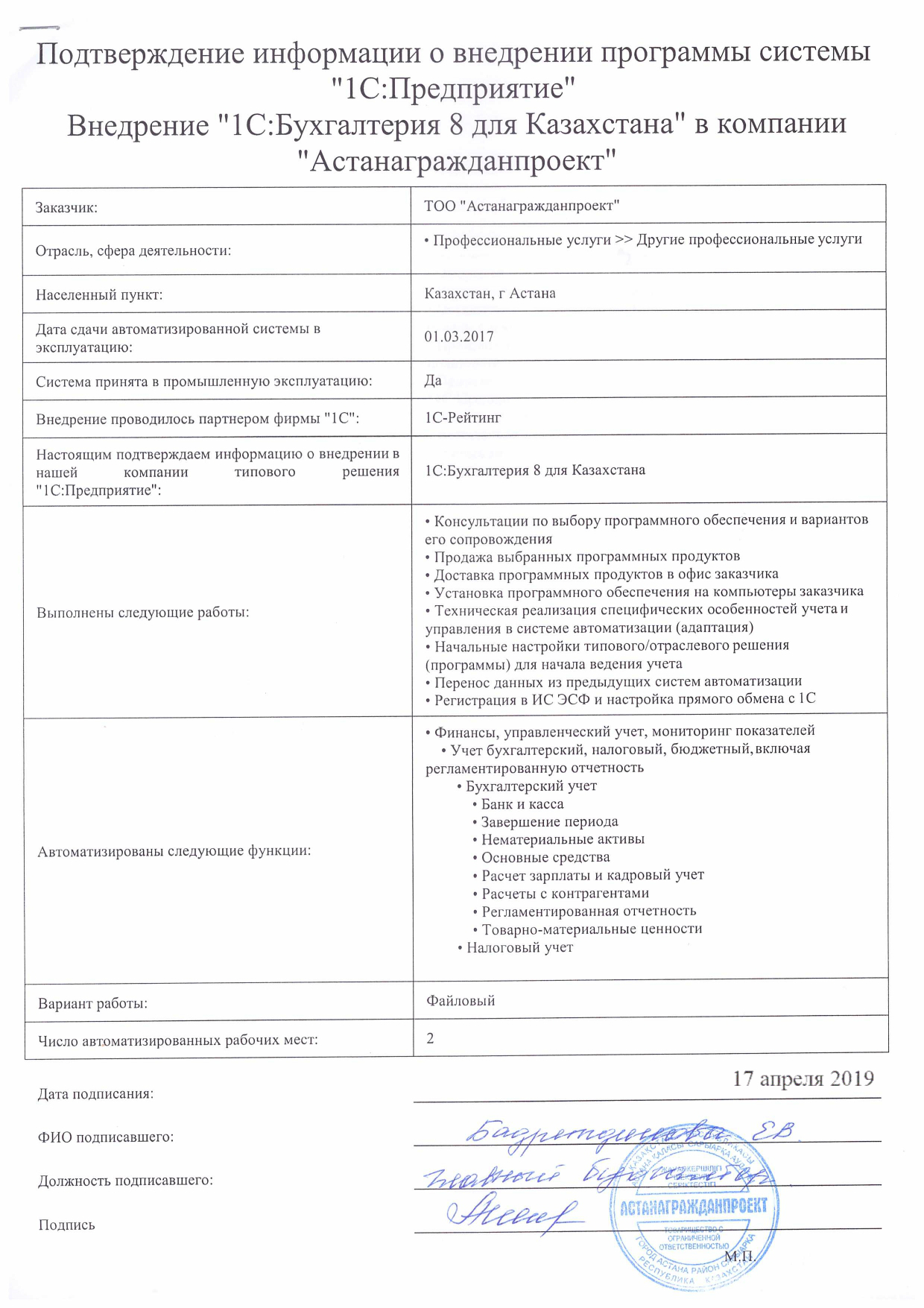 | Внедренное типовое решение: | 1С:Бухгалтерия 8 для Казахстана |
