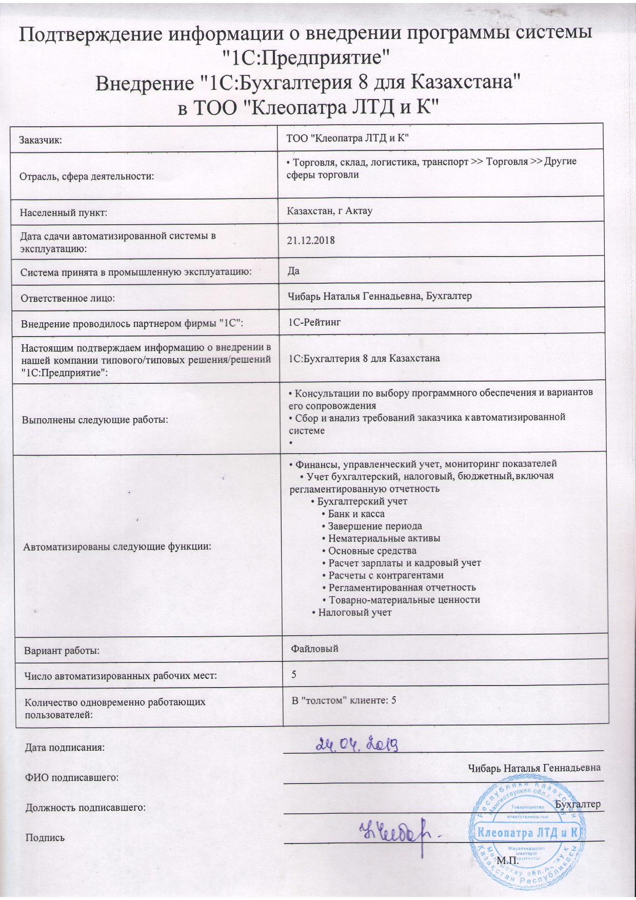 | Внедренное типовое решение: | 1С:Бухгалтерия 8 для Казахстана |