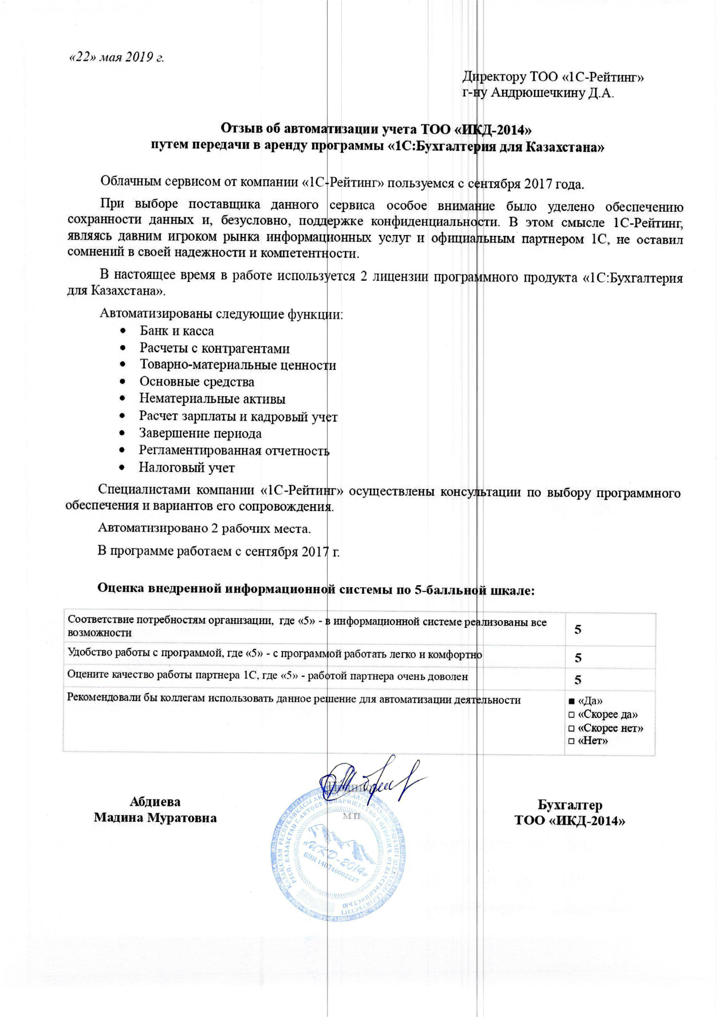 | Арендованное типовое решение: | 1С:Бухгалтерия для Казахстана |