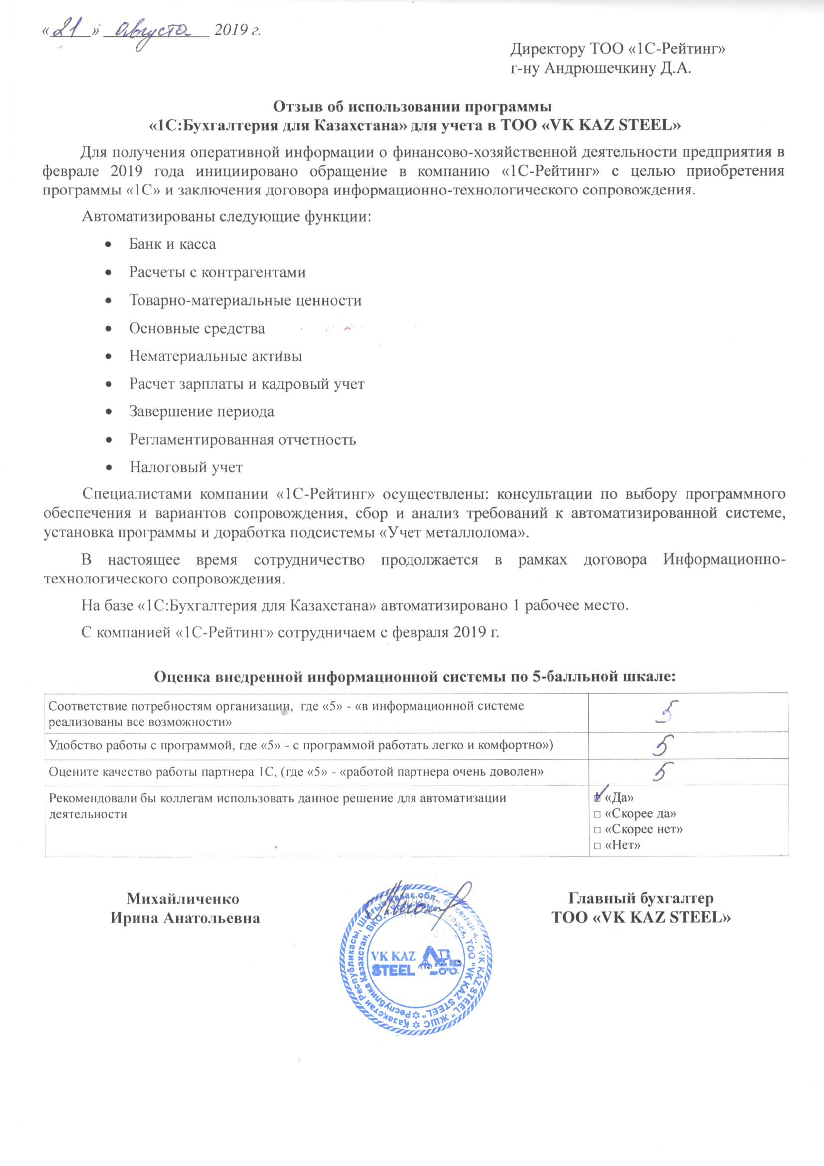 | Внедренное типовое решение: | 1С:Бухгалтерия 8 для Казахстана |