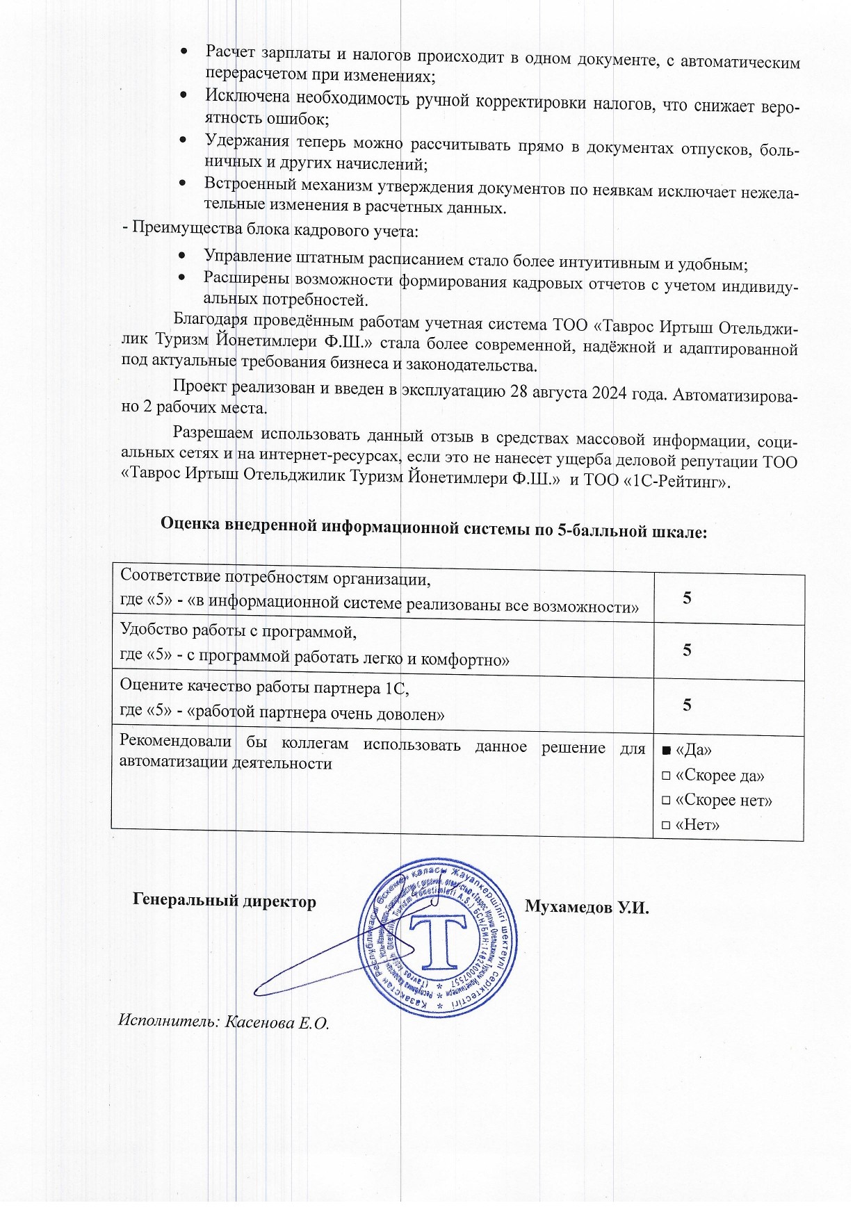 Благодаря проведённым работам, учетная система ТОО «Таврос Иртыш Отельджилик Туризм Йонетимлери Ф.Ш.» стала более современной, надёжной и адаптированной под актуальные требования бизнеса и законодательства.